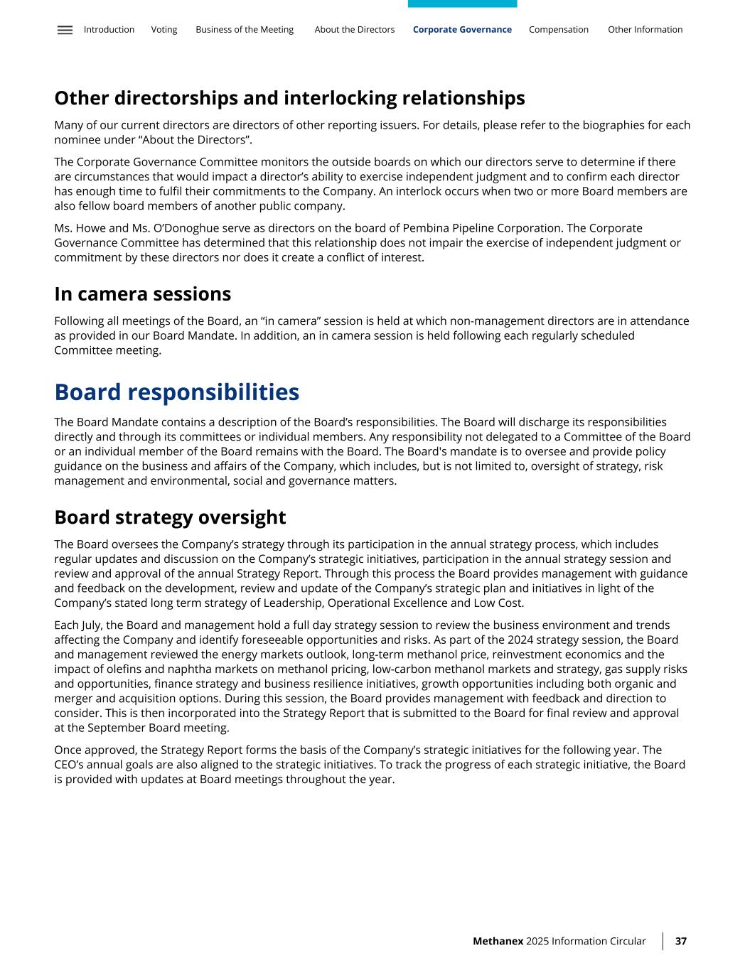 Other directorships and interlocking relationships Many of our current directors are directors of other reporting issuers. For details, please refer to the biographies for each nominee under “About the Directors”. The Corporate Governance Committee monitors the outside boards on which our directors serve to determine if there are circumstances that would impact a director’s ability to exercise independent judgment and to confirm each director has enough time to fulfil their commitments to the Company. An interlock occurs when two or more Board members are also fellow board members of another public company. Ms. Howe and Ms. O’Donoghue serve as directors on the board of Pembina Pipeline Corporation. The Corporate Governance Committee has determined that this relationship does not impair the exercise of independent judgment or commitment by these directors nor does it create a conflict of interest. In camera sessions Following all meetings of the Board, an “in camera” session is held at which non-management directors are in attendance as provided in our Board Mandate. In addition, an in camera session is held following each regularly scheduled Committee meeting. Board responsibilities The Board Mandate contains a description of the Board’s responsibilities. The Board will discharge its responsibilities directly and through its committees or individual members. Any responsibility not delegated to a Committee of the Board or an individual member of the Board remains with the Board. The Board's mandate is to oversee and provide policy guidance on the business and affairs of the Company, which includes, but is not limited to, oversight of strategy, risk management and environmental, social and governance matters. Board strategy oversight The Board oversees the Company’s strategy through its participation in the annual strategy process, which includes regular updates and discussion on the Company’s strategic initiatives, participation in the annual strategy session and review and approval of the annual Strategy Report. Through this process the Board provides management with guidance and feedback on the development, review and update of the Company’s strategic plan and initiatives in light of the Company’s stated long term strategy of Leadership, Operational Excellence and Low Cost. Each July, the Board and management hold a full day strategy session to review the business environment and trends affecting the Company and identify foreseeable opportunities and risks. As part of the 2024 strategy session, the Board and management reviewed the energy markets outlook, long-term methanol price, reinvestment economics and the impact of olefins and naphtha markets on methanol pricing, low-carbon methanol markets and strategy, gas supply risks and opportunities, finance strategy and business resilience initiatives, growth opportunities including both organic and merger and acquisition options. During this session, the Board provides management with feedback and direction to consider. This is then incorporated into the Strategy Report that is submitted to the Board for final review and approval at the September Board meeting. Once approved, the Strategy Report forms the basis of the Company’s strategic initiatives for the following year. The CEO’s annual goals are also aligned to the strategic initiatives. To track the progress of each strategic initiative, the Board is provided with updates at Board meetings throughout the year. Introduction Voting Business of the Meeting About the Directors Corporate Governance Compensation Other Information Methanex 2025 Information Circular 37