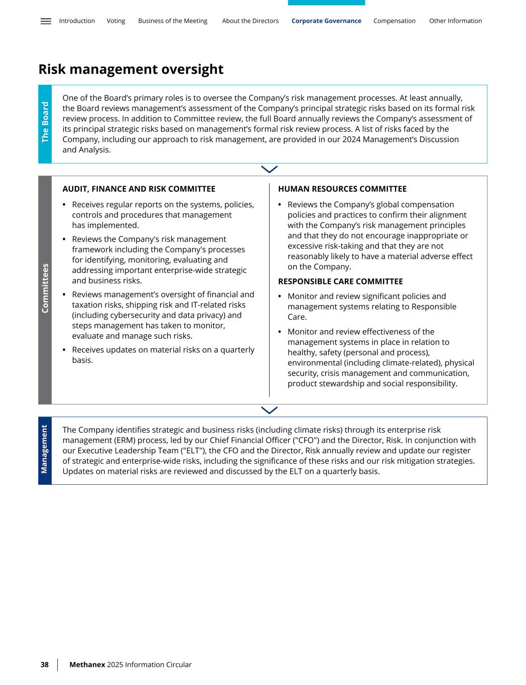 Risk management oversight One of the Board’s primary roles is to oversee the Company’s risk management processes. At least annually, the Board reviews management’s assessment of the Company’s principal strategic risks based on its formal risk review process. In addition to Committee review, the full Board annually reviews the Company’s assessment of its principal strategic risks based on management’s formal risk review process. A list of risks faced by the Company, including our approach to risk management, are provided in our 2024 Management’s Discussion and Analysis. AUDIT, FINANCE AND RISK COMMITTEE • Receives regular reports on the systems, policies, controls and procedures that management has implemented. • Reviews the Company's risk management framework including the Company's processes for identifying, monitoring, evaluating and addressing important enterprise-wide strategic and business risks. • Reviews management’s oversight of financial and taxation risks, shipping risk and IT-related risks (including cybersecurity and data privacy) and steps management has taken to monitor, evaluate and manage such risks. • Receives updates on material risks on a quarterly basis. HUMAN RESOURCES COMMITTEE • Reviews the Company’s global compensation policies and practices to confirm their alignment with the Company’s risk management principles and that they do not encourage inappropriate or excessive risk-taking and that they are not reasonably likely to have a material adverse effect on the Company. RESPONSIBLE CARE COMMITTEE • Monitor and review significant policies and management systems relating to Responsible Care. • Monitor and review effectiveness of the management systems in place in relation to healthy, safety (personal and process), environmental (including climate-related), physical security, crisis management and communication, product stewardship and social responsibility. The Company identifies strategic and business risks (including climate risks) through its enterprise risk management (ERM) process, led by our Chief Financial Officer ("CFO") and the Director, Risk. In conjunction with our Executive Leadership Team ("ELT"), the CFO and the Director, Risk annually review and update our register of strategic and enterprise-wide risks, including the significance of these risks and our risk mitigation strategies. Updates on material risks are reviewed and discussed by the ELT on a quarterly basis. Introduction Voting Business of the Meeting About the Directors Corporate Governance Compensation Other Information 38 Methanex 2025 Information Circular