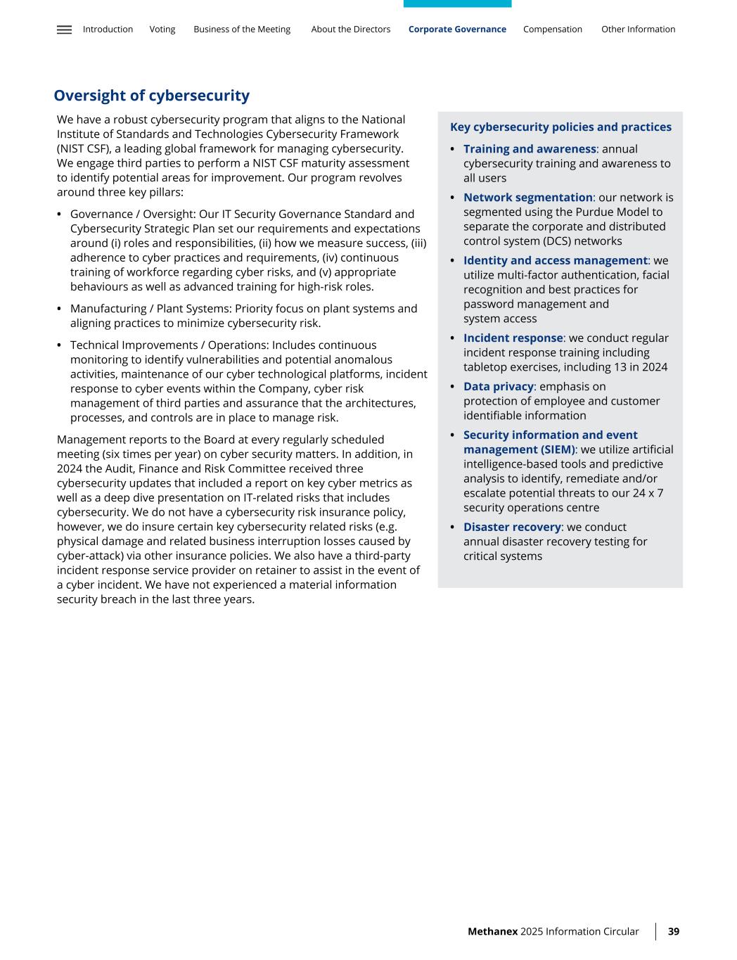 Oversight of cybersecurity We have a robust cybersecurity program that aligns to the National Institute of Standards and Technologies Cybersecurity Framework (NIST CSF), a leading global framework for managing cybersecurity. We engage third parties to perform a NIST CSF maturity assessment to identify potential areas for improvement. Our program revolves around three key pillars: • Governance / Oversight: Our IT Security Governance Standard and Cybersecurity Strategic Plan set our requirements and expectations around (i) roles and responsibilities, (ii) how we measure success, (iii) adherence to cyber practices and requirements, (iv) continuous training of workforce regarding cyber risks, and (v) appropriate behaviours as well as advanced training for high-risk roles. • Manufacturing / Plant Systems: Priority focus on plant systems and aligning practices to minimize cybersecurity risk. • Technical Improvements / Operations: Includes continuous monitoring to identify vulnerabilities and potential anomalous activities, maintenance of our cyber technological platforms, incident response to cyber events within the Company, cyber risk management of third parties and assurance that the architectures, processes, and controls are in place to manage risk. Management reports to the Board at every regularly scheduled meeting (six times per year) on cyber security matters. In addition, in 2024 the Audit, Finance and Risk Committee received three cybersecurity updates that included a report on key cyber metrics as well as a deep dive presentation on IT-related risks that includes cybersecurity. We do not have a cybersecurity risk insurance policy, however, we do insure certain key cybersecurity related risks (e.g. physical damage and related business interruption losses caused by cyber-attack) via other insurance policies. We also have a third-party incident response service provider on retainer to assist in the event of a cyber incident. We have not experienced a material information security breach in the last three years. Key cybersecurity policies and practices • Training and awareness: annual cybersecurity training and awareness to all users • Network segmentation: our network is segmented using the Purdue Model to separate the corporate and distributed control system (DCS) networks • Identity and access management: we utilize multi-factor authentication, facial recognition and best practices for password management and system access • Incident response: we conduct regular incident response training including tabletop exercises, including 13 in 2024 • Data privacy: emphasis on protection of employee and customer identifiable information • Security information and event management (SIEM): we utilize artificial intelligence-based tools and predictive analysis to identify, remediate and/or escalate potential threats to our 24 x 7 security operations centre • Disaster recovery: we conduct annual disaster recovery testing for critical systems Introduction Voting Business of the Meeting About the Directors Corporate Governance Compensation Other Information Methanex 2025 Information Circular 39