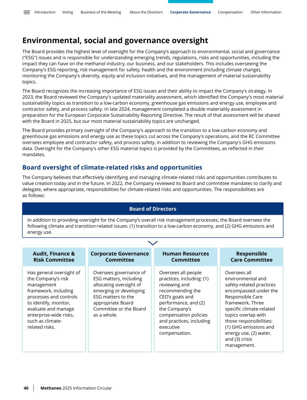 Environmental, social and governance oversight The Board provides the highest level of oversight for the Company’s approach to environmental, social and governance ("ESG") issues and is responsible for understanding emerging trends, regulations, risks and opportunities, including the impact they can have on the methanol industry, our business, and our stakeholders. This includes overseeing the Company's ESG reporting, risk management for safety, health and the environment (including climate change), monitoring the Company's diversity, equity and inclusion initiatives, and the management of material sustainability topics. The Board recognizes the increasing importance of ESG issues and their ability to impact the Company's strategy. In 2023, the Board reviewed the Company's updated materiality assessment, which identified the Company's most material sustainability topics as transition to a low-carbon economy, greenhouse gas emissions and energy use, employee and contractor safety, and process safety. In late 2024, management completed a double materiality assessment in preparation for the European Corporate Sustainability Reporting Directive. The result of that assessment will be shared with the Board in 2025, but our most material sustainability topics are unchanged. The Board provides primary oversight of the Company's approach to the transition to a low-carbon economy and greenhouse gas emissions and energy use as these topics cut across the Company's operations, and the RC Committee oversees employee and contractor safety, and process safety, in addition to reviewing the Company's GHG emissions data. Oversight for the Company's other ESG material topics is provided by the Committees, as reflected in their mandates. Board oversight of climate-related risks and opportunities The Company believes that effectively identifying and managing climate-related risks and opportunities contributes to value creation today and in the future. In 2022, the Company reviewed its Board and committee mandates to clarify and delegate, where appropriate, responsibilities for climate-related risks and opportunities. The responsibilities are as follows: Board of Directors In addition to providing oversight for the Company’s overall risk management processes, the Board oversees the following climate and transition-related issues: (1) transition to a low-carbon economy, and (2) GHG emissions and energy use. Audit, Finance & Risk Committee Corporate Governance Committee Human Resources Committee Responsible Care Committee Has general oversight of the Company’s risk management framework, including processes and controls to identify, monitor, evaluate and manage enterprise-wide risks, such as climate- related risks. Oversees governance of ESG matters, including allocating oversight of emerging or developing ESG matters to the appropriate Board Committee or the Board as a whole. Oversees all people practices, including: (1) reviewing and recommending the CEO’s goals and performance, and (2) the Company’s compensation policies and practices, including executive compensation. Oversees all environmental and safety-related practices encompassed under the Responsible Care framework. Three specific climate-related topics overlap with those responsibilities: (1) GHG emissions and energy use, (2) water, and (3) crisis management. Introduction Voting Business of the Meeting About the Directors Corporate Governance Compensation Other Information 40 Methanex 2025 Information Circular
