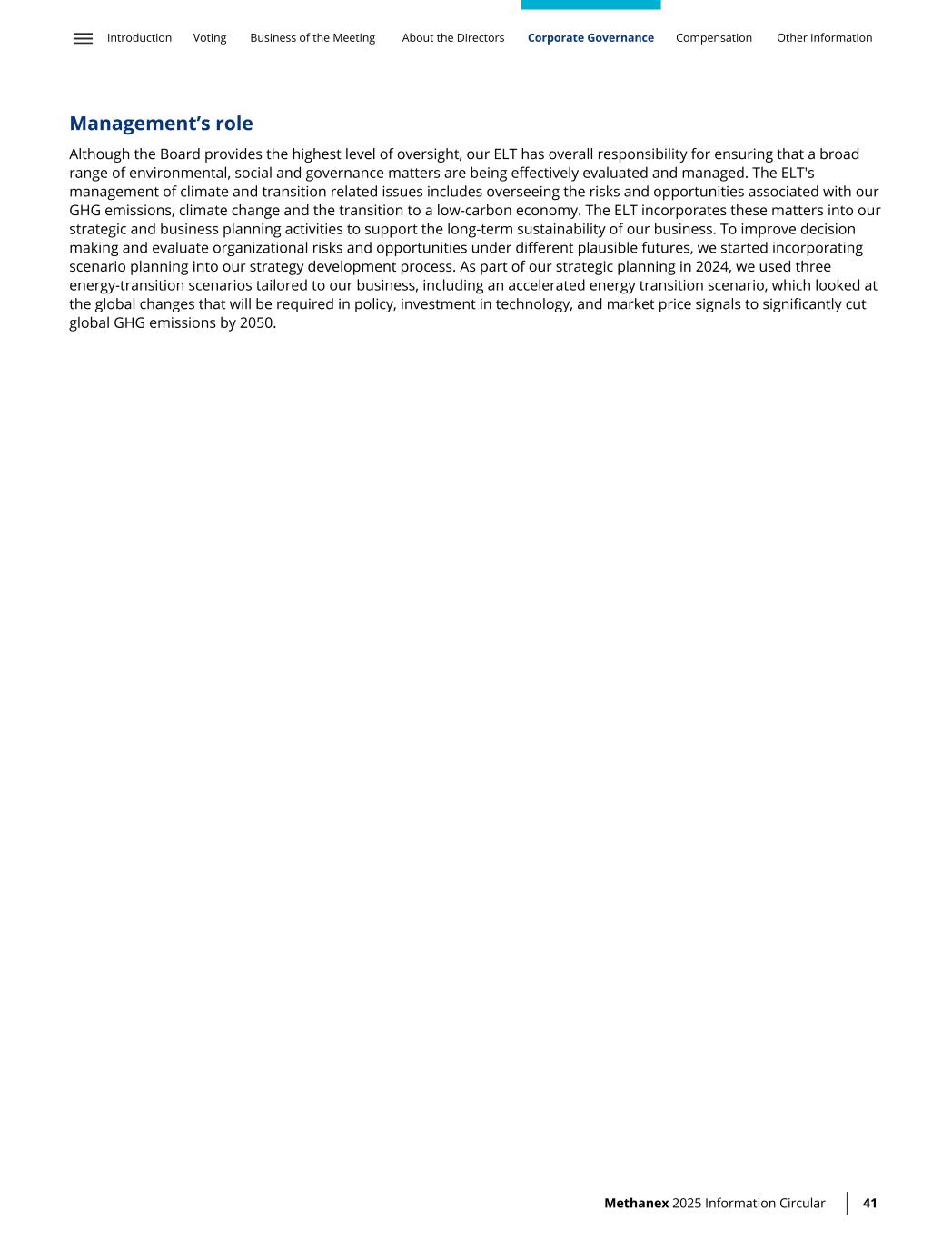 Management’s role Although the Board provides the highest level of oversight, our ELT has overall responsibility for ensuring that a broad range of environmental, social and governance matters are being effectively evaluated and managed. The ELT's management of climate and transition related issues includes overseeing the risks and opportunities associated with our GHG emissions, climate change and the transition to a low-carbon economy. The ELT incorporates these matters into our strategic and business planning activities to support the long-term sustainability of our business. To improve decision making and evaluate organizational risks and opportunities under different plausible futures, we started incorporating scenario planning into our strategy development process. As part of our strategic planning in 2024, we used three energy-transition scenarios tailored to our business, including an accelerated energy transition scenario, which looked at the global changes that will be required in policy, investment in technology, and market price signals to significantly cut global GHG emissions by 2050. Introduction Voting Business of the Meeting About the Directors Corporate Governance Compensation Other Information Methanex 2025 Information Circular 41