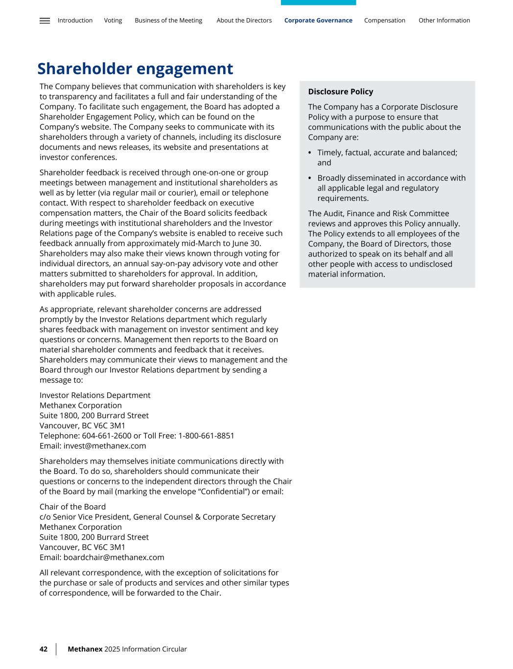 Shareholder engagement The Company believes that communication with shareholders is key to transparency and facilitates a full and fair understanding of the Company. To facilitate such engagement, the Board has adopted a Shareholder Engagement Policy, which can be found on the Company’s website. The Company seeks to communicate with its shareholders through a variety of channels, including its disclosure documents and news releases, its website and presentations at investor conferences. Shareholder feedback is received through one-on-one or group meetings between management and institutional shareholders as well as by letter (via regular mail or courier), email or telephone contact. With respect to shareholder feedback on executive compensation matters, the Chair of the Board solicits feedback during meetings with institutional shareholders and the Investor Relations page of the Company’s website is enabled to receive such feedback annually from approximately mid-March to June 30. Shareholders may also make their views known through voting for individual directors, an annual say-on-pay advisory vote and other matters submitted to shareholders for approval. In addition, shareholders may put forward shareholder proposals in accordance with applicable rules. As appropriate, relevant shareholder concerns are addressed promptly by the Investor Relations department which regularly shares feedback with management on investor sentiment and key questions or concerns. Management then reports to the Board on material shareholder comments and feedback that it receives. Shareholders may communicate their views to management and the Board through our Investor Relations department by sending a message to: Investor Relations Department Methanex Corporation Suite 1800, 200 Burrard Street Vancouver, BC V6C 3M1 Telephone: 604-661-2600 or Toll Free: 1-800-661-8851 Email: invest@methanex.com Shareholders may themselves initiate communications directly with the Board. To do so, shareholders should communicate their questions or concerns to the independent directors through the Chair of the Board by mail (marking the envelope “Confidential”) or email: Chair of the Board c/o Senior Vice President, General Counsel & Corporate Secretary Methanex Corporation Suite 1800, 200 Burrard Street Vancouver, BC V6C 3M1 Email: boardchair@methanex.com All relevant correspondence, with the exception of solicitations for the purchase or sale of products and services and other similar types of correspondence, will be forwarded to the Chair. Disclosure Policy The Company has a Corporate Disclosure Policy with a purpose to ensure that communications with the public about the Company are: • Timely, factual, accurate and balanced; and • Broadly disseminated in accordance with all applicable legal and regulatory requirements. The Audit, Finance and Risk Committee reviews and approves this Policy annually. The Policy extends to all employees of the Company, the Board of Directors, those authorized to speak on its behalf and all other people with access to undisclosed material information. Introduction Voting Business of the Meeting About the Directors Corporate Governance Compensation Other Information 42 Methanex 2025 Information Circular