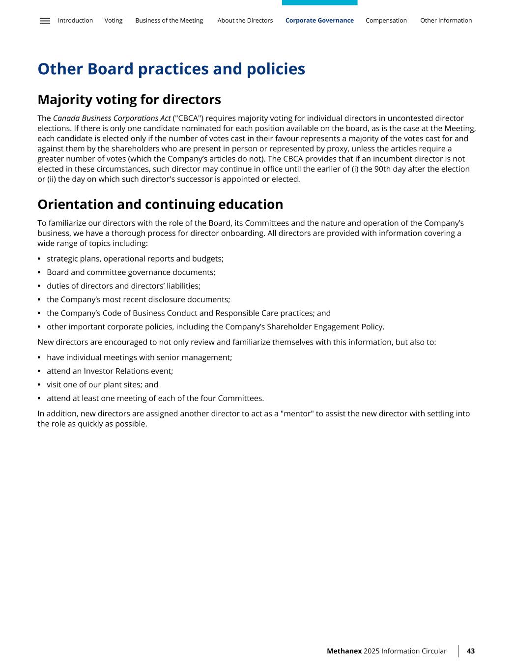 Other Board practices and policies Majority voting for directors The Canada Business Corporations Act ("CBCA") requires majority voting for individual directors in uncontested director elections. If there is only one candidate nominated for each position available on the board, as is the case at the Meeting, each candidate is elected only if the number of votes cast in their favour represents a majority of the votes cast for and against them by the shareholders who are present in person or represented by proxy, unless the articles require a greater number of votes (which the Company’s articles do not). The CBCA provides that if an incumbent director is not elected in these circumstances, such director may continue in office until the earlier of (i) the 90th day after the election or (ii) the day on which such director's successor is appointed or elected. Orientation and continuing education To familiarize our directors with the role of the Board, its Committees and the nature and operation of the Company’s business, we have a thorough process for director onboarding. All directors are provided with information covering a wide range of topics including: • strategic plans, operational reports and budgets; • Board and committee governance documents; • duties of directors and directors’ liabilities; • the Company’s most recent disclosure documents; • the Company’s Code of Business Conduct and Responsible Care practices; and • other important corporate policies, including the Company’s Shareholder Engagement Policy. New directors are encouraged to not only review and familiarize themselves with this information, but also to: • have individual meetings with senior management; • attend an Investor Relations event; • visit one of our plant sites; and • attend at least one meeting of each of the four Committees. In addition, new directors are assigned another director to act as a "mentor" to assist the new director with settling into the role as quickly as possible. Introduction Voting Business of the Meeting About the Directors Corporate Governance Compensation Other Information Methanex 2025 Information Circular 43