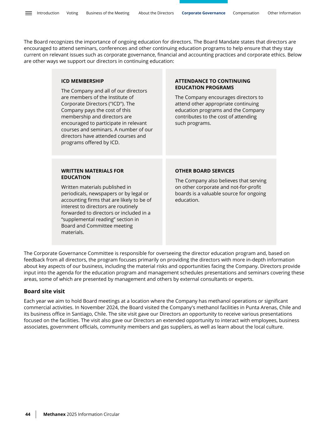 The Board recognizes the importance of ongoing education for directors. The Board Mandate states that directors are encouraged to attend seminars, conferences and other continuing education programs to help ensure that they stay current on relevant issues such as corporate governance, financial and accounting practices and corporate ethics. Below are other ways we support our directors in continuing education: ICD MEMBERSHIP The Company and all of our directors are members of the Institute of Corporate Directors ("ICD"). The Company pays the cost of this membership and directors are encouraged to participate in relevant courses and seminars. A number of our directors have attended courses and programs offered by ICD. ATTENDANCE TO CONTINUING EDUCATION PROGRAMS The Company encourages directors to attend other appropriate continuing education programs and the Company contributes to the cost of attending such programs. WRITTEN MATERIALS FOR EDUCATION Written materials published in periodicals, newspapers or by legal or accounting firms that are likely to be of interest to directors are routinely forwarded to directors or included in a “supplemental reading” section in Board and Committee meeting materials. OTHER BOARD SERVICES The Company also believes that serving on other corporate and not-for-profit boards is a valuable source for ongoing education. The Corporate Governance Committee is responsible for overseeing the director education program and, based on feedback from all directors, the program focuses primarily on providing the directors with more in-depth information about key aspects of our business, including the material risks and opportunities facing the Company. Directors provide input into the agenda for the education program and management schedules presentations and seminars covering these areas, some of which are presented by management and others by external consultants or experts. Board site visit Each year we aim to hold Board meetings at a location where the Company has methanol operations or significant commercial activities. In November 2024, the Board visited the Company's methanol facilities in Punta Arenas, Chile and its business office in Santiago, Chile. The site visit gave our Directors an opportunity to receive various presentations focused on the facilities. The visit also gave our Directors an extended opportunity to interact with employees, business associates, government officials, community members and gas suppliers, as well as learn about the local culture. Introduction Voting Business of the Meeting About the Directors Corporate Governance Compensation Other Information 44 Methanex 2025 Information Circular