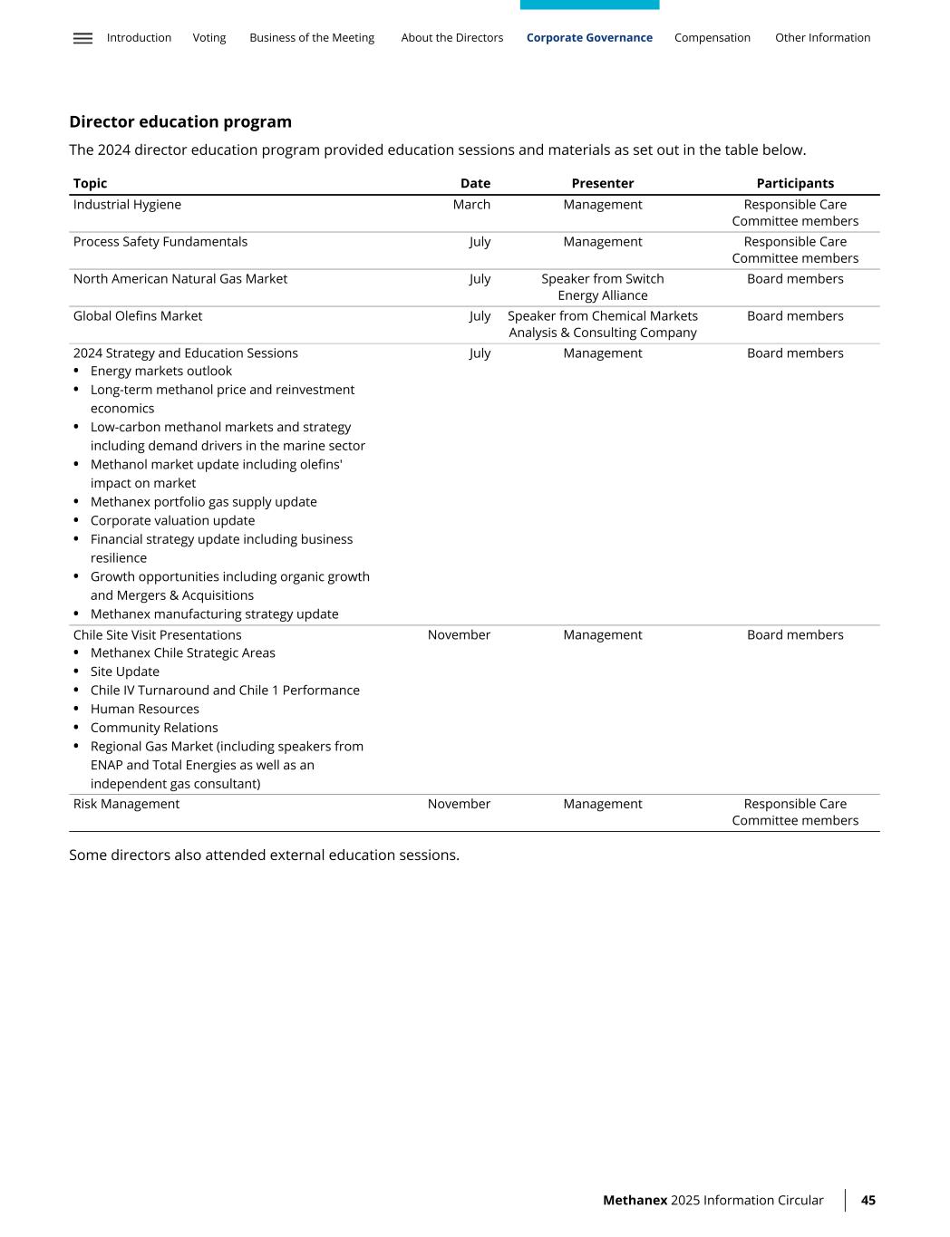 Director education program The 2024 director education program provided education sessions and materials as set out in the table below. Topic Date Presenter Participants Industrial Hygiene March Management Responsible Care Committee members Process Safety Fundamentals July Management Responsible Care Committee members North American Natural Gas Market July Speaker from Switch Energy Alliance Board members Global Olefins Market July Speaker from Chemical Markets Analysis & Consulting Company Board members 2024 Strategy and Education Sessions • Energy markets outlook • Long-term methanol price and reinvestment economics • Low-carbon methanol markets and strategy including demand drivers in the marine sector • Methanol market update including olefins' impact on market • Methanex portfolio gas supply update • Corporate valuation update • Financial strategy update including business resilience • Growth opportunities including organic growth and Mergers & Acquisitions • Methanex manufacturing strategy update July Management Board members Chile Site Visit Presentations • Methanex Chile Strategic Areas • Site Update • Chile IV Turnaround and Chile 1 Performance • Human Resources • Community Relations • Regional Gas Market (including speakers from ENAP and Total Energies as well as an independent gas consultant) November Management Board members Risk Management November Management Responsible Care Committee members Some directors also attended external education sessions. Introduction Voting Business of the Meeting About the Directors Corporate Governance Compensation Other Information Methanex 2025 Information Circular 45