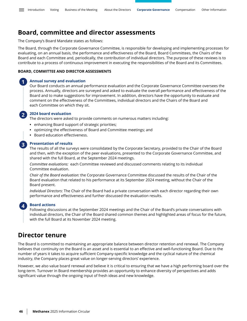 Board, committee and director assessments The Company’s Board Mandate states as follows: The Board, through the Corporate Governance Committee, is responsible for developing and implementing processes for evaluating, on an annual basis, the performance and effectiveness of the Board, Board Committees, the Chairs of the Board and each Committee and, periodically, the contribution of individual directors. The purpose of these reviews is to contribute to a process of continuous improvement in executing the responsibilities of the Board and its Committees. BOARD, COMMITTEE AND DIRECTOR ASSESSMENTS Annual survey and evaluation Our Board conducts an annual performance evaluation and the Corporate Governance Committee oversees the process. Annually, directors are surveyed and asked to evaluate the overall performance and effectiveness of the Board and to make suggestions for improvement. In addition, directors have the opportunity to evaluate and comment on the effectiveness of the Committees, individual directors and the Chairs of the Board and each Committee on which they sit. 2024 board evaluation The directors were asked to provide comments on numerous matters including: • enhancing Board support of strategic priorities; • optimizing the effectiveness of Board and Committee meetings; and • Board education effectiveness. Presentation of results The results of all the surveys were consolidated by the Corporate Secretary, provided to the Chair of the Board and then, with the exception of the peer evaluations, presented to the Corporate Governance Committee, and shared with the full Board, at the September 2024 meetings. Committee evaluations: each Committee reviewed and discussed comments relating to its individual Committee evaluation. Chair of the Board evaluation: the Corporate Governance Committee discussed the results of the Chair of the Board evaluation that related to his performance at its September 2024 meeting, without the Chair of the Board present. Individual Directors: The Chair of the Board had a private conversation with each director regarding their own performance and effectiveness and further discussed the evaluation results. Board actions Following discussions at the September 2024 meetings and the Chair of the Board’s private conversations with individual directors, the Chair of the Board shared common themes and highlighted areas of focus for the future, with the full Board at its November 2024 meeting. Director tenure The Board is committed to maintaining an appropriate balance between director retention and renewal. The Company believes that continuity on the Board is an asset and is essential to an effective and well-functioning Board. Due to the number of years it takes to acquire sufficient Company-specific knowledge and the cyclical nature of the chemical industry, the Company places great value on longer-serving directors’ experience. However, we also value board renewal and believe it is critical to ensuring that we have a high performing board over the long-term. Turnover in Board membership provides an opportunity to enhance diversity of perspectives and adds significant value through the ongoing input of fresh ideas and new knowledge. Introduction Voting Business of the Meeting About the Directors Corporate Governance Compensation Other Information 46 Methanex 2025 Information Circular