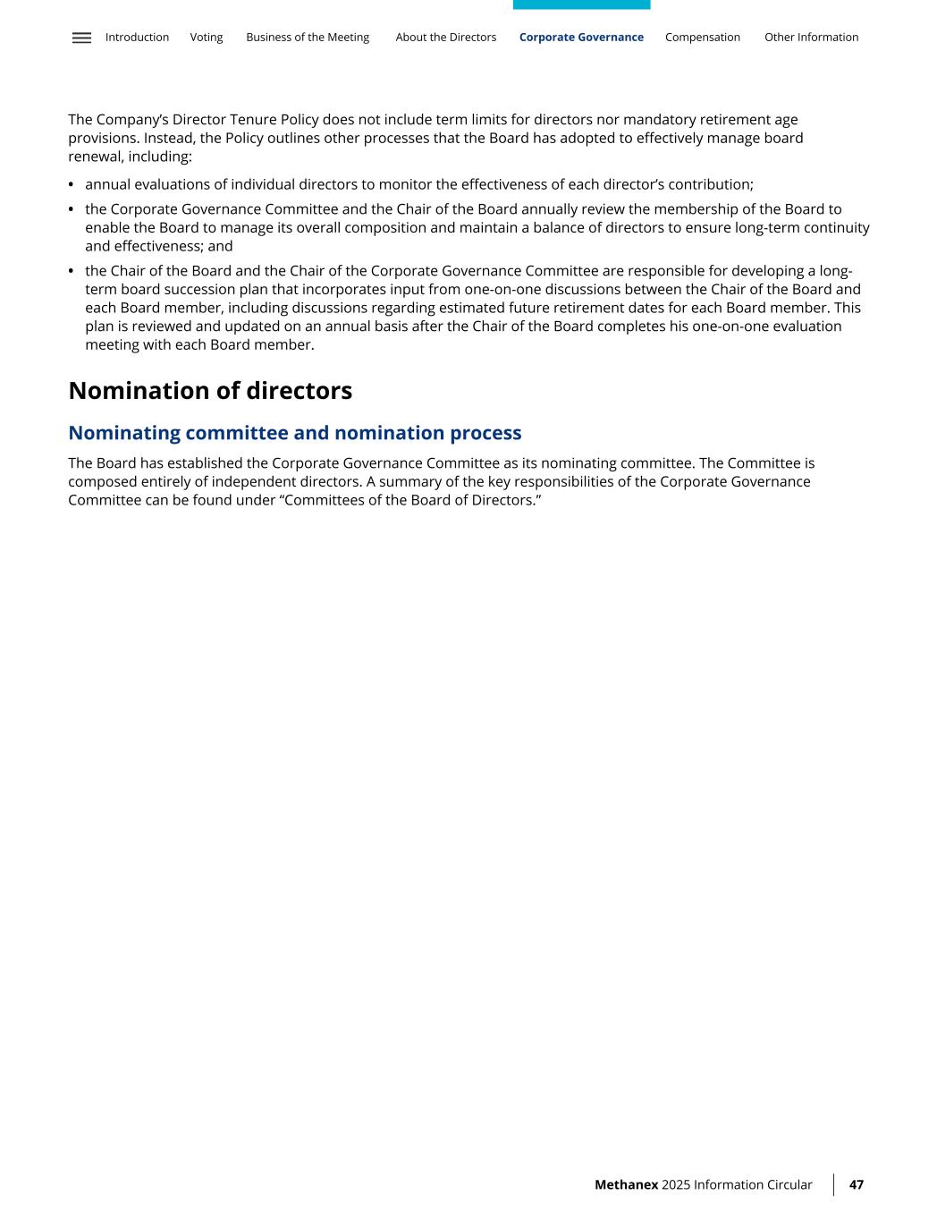 The Company’s Director Tenure Policy does not include term limits for directors nor mandatory retirement age provisions. Instead, the Policy outlines other processes that the Board has adopted to effectively manage board renewal, including: • annual evaluations of individual directors to monitor the effectiveness of each director’s contribution; • the Corporate Governance Committee and the Chair of the Board annually review the membership of the Board to enable the Board to manage its overall composition and maintain a balance of directors to ensure long-term continuity and effectiveness; and • the Chair of the Board and the Chair of the Corporate Governance Committee are responsible for developing a long- term board succession plan that incorporates input from one-on-one discussions between the Chair of the Board and each Board member, including discussions regarding estimated future retirement dates for each Board member. This plan is reviewed and updated on an annual basis after the Chair of the Board completes his one-on-one evaluation meeting with each Board member. Nomination of directors Nominating committee and nomination process The Board has established the Corporate Governance Committee as its nominating committee. The Committee is composed entirely of independent directors. A summary of the key responsibilities of the Corporate Governance Committee can be found under “Committees of the Board of Directors.” Introduction Voting Business of the Meeting About the Directors Corporate Governance Compensation Other Information Methanex 2025 Information Circular 47