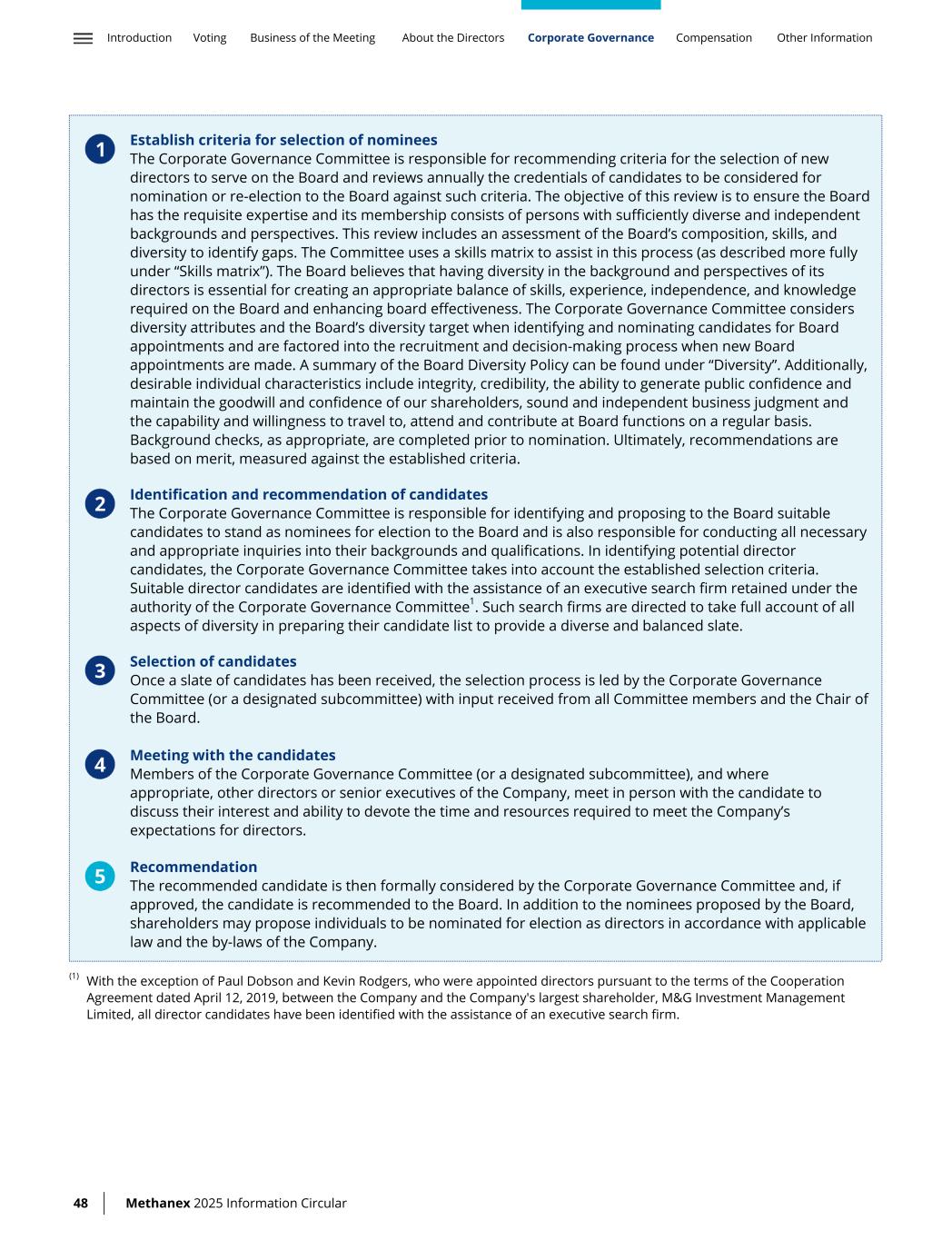 Establish criteria for selection of nominees The Corporate Governance Committee is responsible for recommending criteria for the selection of new directors to serve on the Board and reviews annually the credentials of candidates to be considered for nomination or re-election to the Board against such criteria. The objective of this review is to ensure the Board has the requisite expertise and its membership consists of persons with sufficiently diverse and independent backgrounds and perspectives. This review includes an assessment of the Board’s composition, skills, and diversity to identify gaps. The Committee uses a skills matrix to assist in this process (as described more fully under “Skills matrix”). The Board believes that having diversity in the background and perspectives of its directors is essential for creating an appropriate balance of skills, experience, independence, and knowledge required on the Board and enhancing board effectiveness. The Corporate Governance Committee considers diversity attributes and the Board’s diversity target when identifying and nominating candidates for Board appointments and are factored into the recruitment and decision-making process when new Board appointments are made. A summary of the Board Diversity Policy can be found under “Diversity”. Additionally, desirable individual characteristics include integrity, credibility, the ability to generate public confidence and maintain the goodwill and confidence of our shareholders, sound and independent business judgment and the capability and willingness to travel to, attend and contribute at Board functions on a regular basis. Background checks, as appropriate, are completed prior to nomination. Ultimately, recommendations are based on merit, measured against the established criteria. Identification and recommendation of candidates The Corporate Governance Committee is responsible for identifying and proposing to the Board suitable candidates to stand as nominees for election to the Board and is also responsible for conducting all necessary and appropriate inquiries into their backgrounds and qualifications. In identifying potential director candidates, the Corporate Governance Committee takes into account the established selection criteria. Suitable director candidates are identified with the assistance of an executive search firm retained under the authority of the Corporate Governance Committee1. Such search firms are directed to take full account of all aspects of diversity in preparing their candidate list to provide a diverse and balanced slate. Selection of candidates Once a slate of candidates has been received, the selection process is led by the Corporate Governance Committee (or a designated subcommittee) with input received from all Committee members and the Chair of the Board. Meeting with the candidates Members of the Corporate Governance Committee (or a designated subcommittee), and where appropriate, other directors or senior executives of the Company, meet in person with the candidate to discuss their interest and ability to devote the time and resources required to meet the Company’s expectations for directors. Recommendation The recommended candidate is then formally considered by the Corporate Governance Committee and, if approved, the candidate is recommended to the Board. In addition to the nominees proposed by the Board, shareholders may propose individuals to be nominated for election as directors in accordance with applicable law and the by-laws of the Company. (1) With the exception of Paul Dobson and Kevin Rodgers, who were appointed directors pursuant to the terms of the Cooperation Agreement dated April 12, 2019, between the Company and the Company's largest shareholder, M&G Investment Management Limited, all director candidates have been identified with the assistance of an executive search firm. Introduction Voting Business of the Meeting About the Directors Corporate Governance Compensation Other Information 48 Methanex 2025 Information Circular