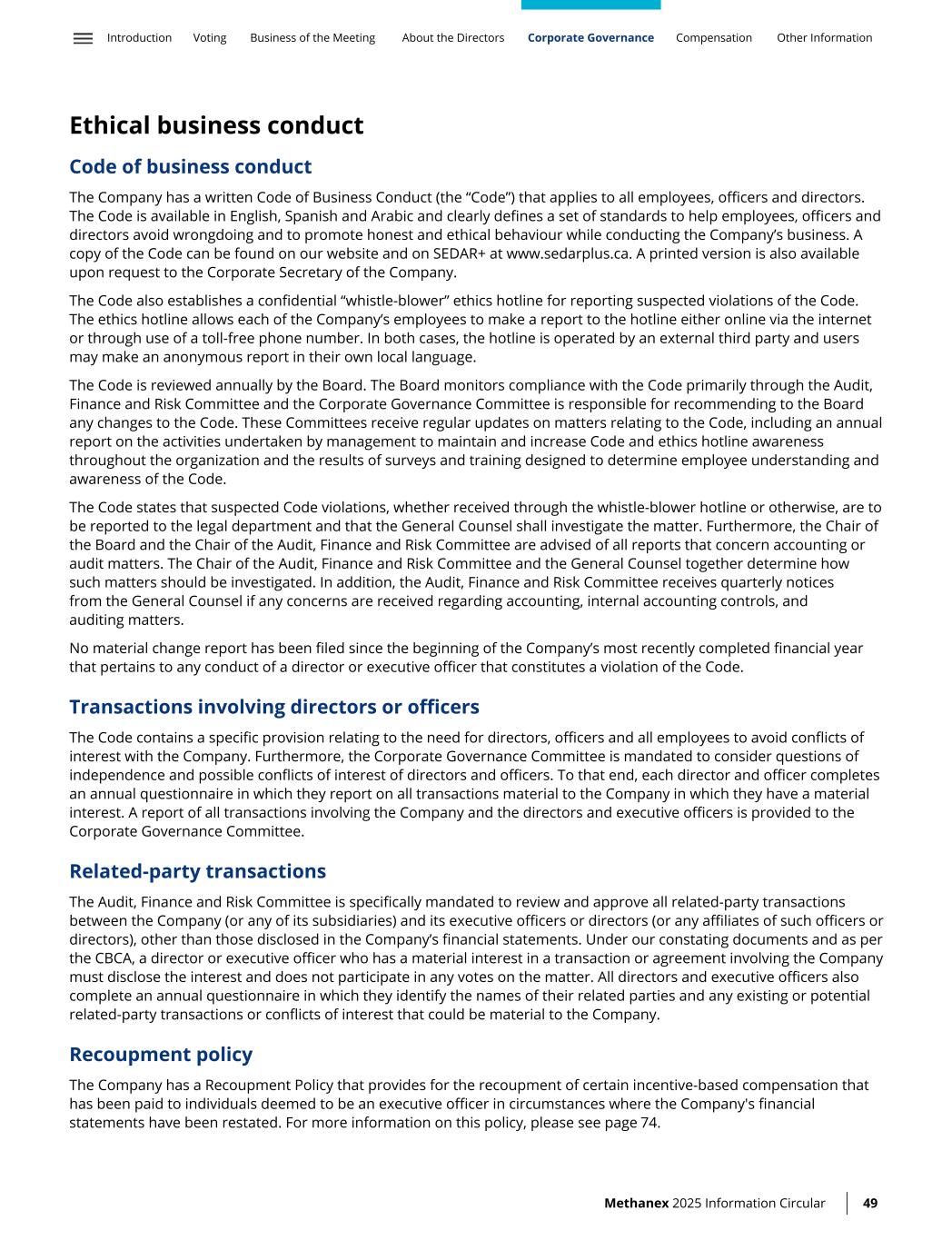 Ethical business conduct Code of business conduct The Company has a written Code of Business Conduct (the “Code”) that applies to all employees, officers and directors. The Code is available in English, Spanish and Arabic and clearly defines a set of standards to help employees, officers and directors avoid wrongdoing and to promote honest and ethical behaviour while conducting the Company’s business. A copy of the Code can be found on our website and on SEDAR+ at www.sedarplus.ca. A printed version is also available upon request to the Corporate Secretary of the Company. The Code also establishes a confidential “whistle-blower” ethics hotline for reporting suspected violations of the Code. The ethics hotline allows each of the Company’s employees to make a report to the hotline either online via the internet or through use of a toll-free phone number. In both cases, the hotline is operated by an external third party and users may make an anonymous report in their own local language. The Code is reviewed annually by the Board. The Board monitors compliance with the Code primarily through the Audit, Finance and Risk Committee and the Corporate Governance Committee is responsible for recommending to the Board any changes to the Code. These Committees receive regular updates on matters relating to the Code, including an annual report on the activities undertaken by management to maintain and increase Code and ethics hotline awareness throughout the organization and the results of surveys and training designed to determine employee understanding and awareness of the Code. The Code states that suspected Code violations, whether received through the whistle-blower hotline or otherwise, are to be reported to the legal department and that the General Counsel shall investigate the matter. Furthermore, the Chair of the Board and the Chair of the Audit, Finance and Risk Committee are advised of all reports that concern accounting or audit matters. The Chair of the Audit, Finance and Risk Committee and the General Counsel together determine how such matters should be investigated. In addition, the Audit, Finance and Risk Committee receives quarterly notices from the General Counsel if any concerns are received regarding accounting, internal accounting controls, and auditing matters. No material change report has been filed since the beginning of the Company’s most recently completed financial year that pertains to any conduct of a director or executive officer that constitutes a violation of the Code. Transactions involving directors or officers The Code contains a specific provision relating to the need for directors, officers and all employees to avoid conflicts of interest with the Company. Furthermore, the Corporate Governance Committee is mandated to consider questions of independence and possible conflicts of interest of directors and officers. To that end, each director and officer completes an annual questionnaire in which they report on all transactions material to the Company in which they have a material interest. A report of all transactions involving the Company and the directors and executive officers is provided to the Corporate Governance Committee. Related-party transactions The Audit, Finance and Risk Committee is specifically mandated to review and approve all related-party transactions between the Company (or any of its subsidiaries) and its executive officers or directors (or any affiliates of such officers or directors), other than those disclosed in the Company’s financial statements. Under our constating documents and as per the CBCA, a director or executive officer who has a material interest in a transaction or agreement involving the Company must disclose the interest and does not participate in any votes on the matter. All directors and executive officers also complete an annual questionnaire in which they identify the names of their related parties and any existing or potential related-party transactions or conflicts of interest that could be material to the Company. Recoupment policy The Company has a Recoupment Policy that provides for the recoupment of certain incentive-based compensation that has been paid to individuals deemed to be an executive officer in circumstances where the Company's financial statements have been restated. For more information on this policy, please see page 74. Introduction Voting Business of the Meeting About the Directors Corporate Governance Compensation Other Information Methanex 2025 Information Circular 49