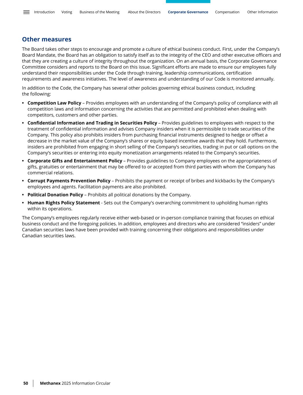 Other measures The Board takes other steps to encourage and promote a culture of ethical business conduct. First, under the Company’s Board Mandate, the Board has an obligation to satisfy itself as to the integrity of the CEO and other executive officers and that they are creating a culture of integrity throughout the organization. On an annual basis, the Corporate Governance Committee considers and reports to the Board on this issue. Significant efforts are made to ensure our employees fully understand their responsibilities under the Code through training, leadership communications, certification requirements and awareness initiatives. The level of awareness and understanding of our Code is monitored annually. In addition to the Code, the Company has several other policies governing ethical business conduct, including the following: • Competition Law Policy – Provides employees with an understanding of the Company’s policy of compliance with all competition laws and information concerning the activities that are permitted and prohibited when dealing with competitors, customers and other parties. • Confidential Information and Trading in Securities Policy – Provides guidelines to employees with respect to the treatment of confidential information and advises Company insiders when it is permissible to trade securities of the Company. This policy also prohibits insiders from purchasing financial instruments designed to hedge or offset a decrease in the market value of the Company’s shares or equity based incentive awards that they hold. Furthermore, insiders are prohibited from engaging in short selling of the Company’s securities, trading in put or call options on the Company’s securities or entering into equity monetization arrangements related to the Company’s securities. • Corporate Gifts and Entertainment Policy – Provides guidelines to Company employees on the appropriateness of gifts, gratuities or entertainment that may be offered to or accepted from third parties with whom the Company has commercial relations. • Corrupt Payments Prevention Policy – Prohibits the payment or receipt of bribes and kickbacks by the Company’s employees and agents. Facilitation payments are also prohibited. • Political Donation Policy – Prohibits all political donations by the Company. • Human Rights Policy Statement - Sets out the Company's overarching commitment to upholding human rights within its operations. The Company’s employees regularly receive either web-based or in-person compliance training that focuses on ethical business conduct and the foregoing policies. In addition, employees and directors who are considered “insiders” under Canadian securities laws have been provided with training concerning their obligations and responsibilities under Canadian securities laws. Introduction Voting Business of the Meeting About the Directors Corporate Governance Compensation Other Information 50 Methanex 2025 Information Circular