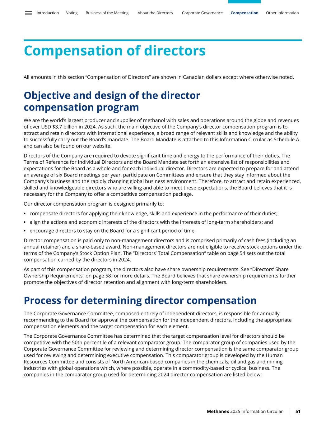 Compensation of directors All amounts in this section “Compensation of Directors” are shown in Canadian dollars except where otherwise noted. Objective and design of the director compensation program We are the world’s largest producer and supplier of methanol with sales and operations around the globe and revenues of over USD $3.7 billion in 2024. As such, the main objective of the Company’s director compensation program is to attract and retain directors with international experience, a broad range of relevant skills and knowledge and the ability to successfully carry out the Board’s mandate. The Board Mandate is attached to this Information Circular as Schedule A and can also be found on our website. Directors of the Company are required to devote significant time and energy to the performance of their duties. The Terms of Reference for Individual Directors and the Board Mandate set forth an extensive list of responsibilities and expectations for the Board as a whole and for each individual director. Directors are expected to prepare for and attend an average of six Board meetings per year, participate on Committees and ensure that they stay informed about the Company’s business and the rapidly changing global business environment. Therefore, to attract and retain experienced, skilled and knowledgeable directors who are willing and able to meet these expectations, the Board believes that it is necessary for the Company to offer a competitive compensation package. Our director compensation program is designed primarily to: • compensate directors for applying their knowledge, skills and experience in the performance of their duties; • align the actions and economic interests of the directors with the interests of long-term shareholders; and • encourage directors to stay on the Board for a significant period of time. Director compensation is paid only to non-management directors and is comprised primarily of cash fees (including an annual retainer) and a share-based award. Non-management directors are not eligible to receive stock options under the terms of the Company’s Stock Option Plan. The “Directors’ Total Compensation” table on page 54 sets out the total compensation earned by the directors in 2024. As part of this compensation program, the directors also have share ownership requirements. See “Directors’ Share Ownership Requirements” on page 58 for more details. The Board believes that share ownership requirements further promote the objectives of director retention and alignment with long-term shareholders. Process for determining director compensation The Corporate Governance Committee, composed entirely of independent directors, is responsible for annually recommending to the Board for approval the compensation for the independent directors, including the appropriate compensation elements and the target compensation for each element. The Corporate Governance Committee has determined that the target compensation level for directors should be competitive with the 50th percentile of a relevant comparator group. The comparator group of companies used by the Corporate Governance Committee for reviewing and determining director compensation is the same comparator group used for reviewing and determining executive compensation. This comparator group is developed by the Human Resources Committee and consists of North American-based companies in the chemicals, oil and gas and mining industries with global operations which, where possible, operate in a commodity-based or cyclical business. The companies in the comparator group used for determining 2024 director compensation are listed below: Introduction Voting Business of the Meeting About the Directors Corporate Governance Compensation Other Information Methanex 2025 Information Circular 51