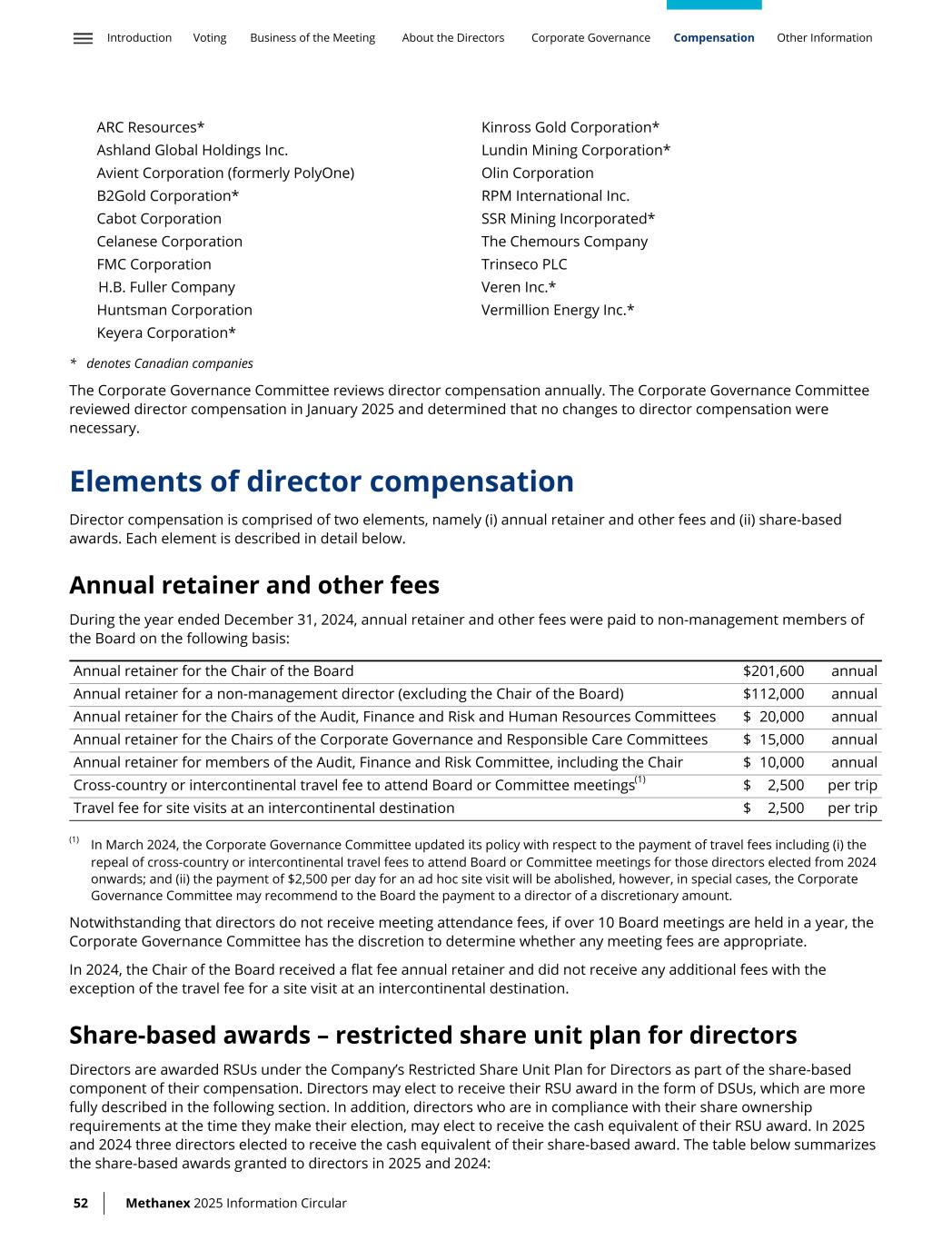 ARC Resources* Kinross Gold Corporation* Ashland Global Holdings Inc. Lundin Mining Corporation* Avient Corporation (formerly PolyOne) Olin Corporation B2Gold Corporation* RPM International Inc. Cabot Corporation SSR Mining Incorporated* Celanese Corporation The Chemours Company FMC Corporation Trinseco PLC H.B. Fuller Company Veren Inc.* Huntsman Corporation Vermillion Energy Inc.* Keyera Corporation* * denotes Canadian companies The Corporate Governance Committee reviews director compensation annually. The Corporate Governance Committee reviewed director compensation in January 2025 and determined that no changes to director compensation were necessary. Elements of director compensation Director compensation is comprised of two elements, namely (i) annual retainer and other fees and (ii) share-based awards. Each element is described in detail below. Annual retainer and other fees During the year ended December 31, 2024, annual retainer and other fees were paid to non-management members of the Board on the following basis: Annual retainer for the Chair of the Board $ 201,600 annual Annual retainer for a non-management director (excluding the Chair of the Board) $ 112,000 annual Annual retainer for the Chairs of the Audit, Finance and Risk and Human Resources Committees $ 20,000 annual Annual retainer for the Chairs of the Corporate Governance and Responsible Care Committees $ 15,000 annual Annual retainer for members of the Audit, Finance and Risk Committee, including the Chair $ 10,000 annual Cross-country or intercontinental travel fee to attend Board or Committee meetings(1) $ 2,500 per trip Travel fee for site visits at an intercontinental destination $ 2,500 per trip (1) In March 2024, the Corporate Governance Committee updated its policy with respect to the payment of travel fees including (i) the repeal of cross-country or intercontinental travel fees to attend Board or Committee meetings for those directors elected from 2024 onwards; and (ii) the payment of $2,500 per day for an ad hoc site visit will be abolished, however, in special cases, the Corporate Governance Committee may recommend to the Board the payment to a director of a discretionary amount. Notwithstanding that directors do not receive meeting attendance fees, if over 10 Board meetings are held in a year, the Corporate Governance Committee has the discretion to determine whether any meeting fees are appropriate. In 2024, the Chair of the Board received a flat fee annual retainer and did not receive any additional fees with the exception of the travel fee for a site visit at an intercontinental destination. Share-based awards – restricted share unit plan for directors Directors are awarded RSUs under the Company’s Restricted Share Unit Plan for Directors as part of the share-based component of their compensation. Directors may elect to receive their RSU award in the form of DSUs, which are more fully described in the following section. In addition, directors who are in compliance with their share ownership requirements at the time they make their election, may elect to receive the cash equivalent of their RSU award. In 2025 and 2024 three directors elected to receive the cash equivalent of their share-based award. The table below summarizes the share-based awards granted to directors in 2025 and 2024: Introduction Voting Business of the Meeting About the Directors Corporate Governance Compensation Other Information 52 Methanex 2025 Information Circular