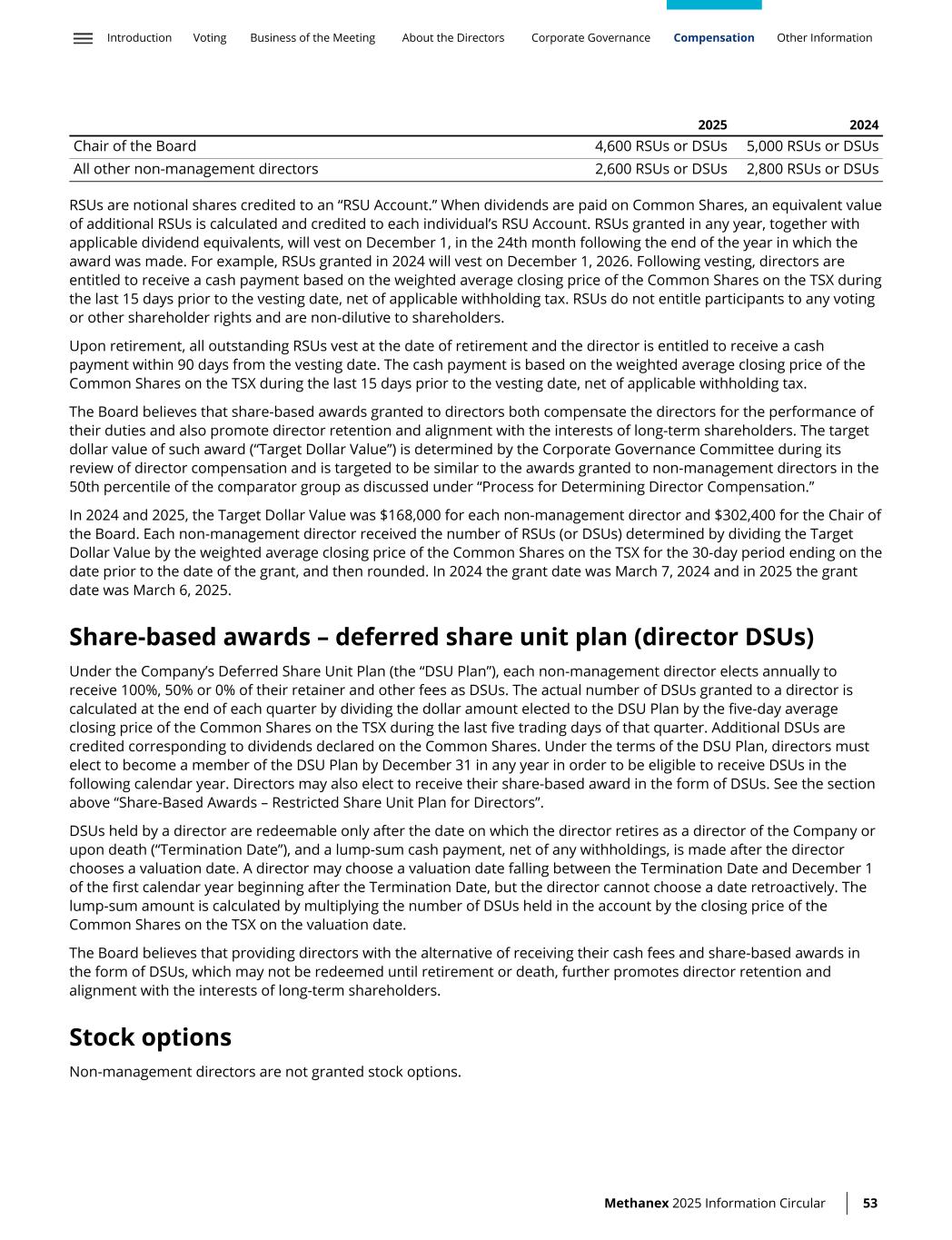 2025 2024 Chair of the Board 4,600 RSUs or DSUs 5,000 RSUs or DSUs All other non-management directors 2,600 RSUs or DSUs 2,800 RSUs or DSUs RSUs are notional shares credited to an “RSU Account.” When dividends are paid on Common Shares, an equivalent value of additional RSUs is calculated and credited to each individual’s RSU Account. RSUs granted in any year, together with applicable dividend equivalents, will vest on December 1, in the 24th month following the end of the year in which the award was made. For example, RSUs granted in 2024 will vest on December 1, 2026. Following vesting, directors are entitled to receive a cash payment based on the weighted average closing price of the Common Shares on the TSX during the last 15 days prior to the vesting date, net of applicable withholding tax. RSUs do not entitle participants to any voting or other shareholder rights and are non-dilutive to shareholders. Upon retirement, all outstanding RSUs vest at the date of retirement and the director is entitled to receive a cash payment within 90 days from the vesting date. The cash payment is based on the weighted average closing price of the Common Shares on the TSX during the last 15 days prior to the vesting date, net of applicable withholding tax. The Board believes that share-based awards granted to directors both compensate the directors for the performance of their duties and also promote director retention and alignment with the interests of long-term shareholders. The target dollar value of such award (“Target Dollar Value”) is determined by the Corporate Governance Committee during its review of director compensation and is targeted to be similar to the awards granted to non-management directors in the 50th percentile of the comparator group as discussed under “Process for Determining Director Compensation.” In 2024 and 2025, the Target Dollar Value was $168,000 for each non-management director and $302,400 for the Chair of the Board. Each non-management director received the number of RSUs (or DSUs) determined by dividing the Target Dollar Value by the weighted average closing price of the Common Shares on the TSX for the 30-day period ending on the date prior to the date of the grant, and then rounded. In 2024 the grant date was March 7, 2024 and in 2025 the grant date was March 6, 2025. Share-based awards – deferred share unit plan (director DSUs) Under the Company’s Deferred Share Unit Plan (the “DSU Plan”), each non-management director elects annually to receive 100%, 50% or 0% of their retainer and other fees as DSUs. The actual number of DSUs granted to a director is calculated at the end of each quarter by dividing the dollar amount elected to the DSU Plan by the five-day average closing price of the Common Shares on the TSX during the last five trading days of that quarter. Additional DSUs are credited corresponding to dividends declared on the Common Shares. Under the terms of the DSU Plan, directors must elect to become a member of the DSU Plan by December 31 in any year in order to be eligible to receive DSUs in the following calendar year. Directors may also elect to receive their share-based award in the form of DSUs. See the section above “Share-Based Awards – Restricted Share Unit Plan for Directors”. DSUs held by a director are redeemable only after the date on which the director retires as a director of the Company or upon death (“Termination Date”), and a lump-sum cash payment, net of any withholdings, is made after the director chooses a valuation date. A director may choose a valuation date falling between the Termination Date and December 1 of the first calendar year beginning after the Termination Date, but the director cannot choose a date retroactively. The lump-sum amount is calculated by multiplying the number of DSUs held in the account by the closing price of the Common Shares on the TSX on the valuation date. The Board believes that providing directors with the alternative of receiving their cash fees and share-based awards in the form of DSUs, which may not be redeemed until retirement or death, further promotes director retention and alignment with the interests of long-term shareholders. Stock options Non-management directors are not granted stock options. Introduction Voting Business of the Meeting About the Directors Corporate Governance Compensation Other Information Methanex 2025 Information Circular 53