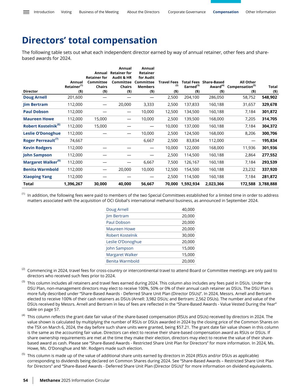 Directors’ total compensation The following table sets out what each independent director earned by way of annual retainer, other fees and share- based awards for 2024. Director Annual Retainer(1) ($) Annual Retainer for Committee Chairs ($) Annual Retainer for Audit & HR Committee Chairs ($) Annual Retainer for Audit Committee Members ($) Travel Fees (2) ($) Total Fees Earned(3) ($) Share-Based Award(4) ($) All Other Compensation(5) ($) Total ($) Doug Arnell 201,600 — — — 2,500 204,100 286,050 58,752 548,902 Jim Bertram 112,000 — 20,000 3,333 2,500 137,833 160,188 31,657 329,678 Paul Dobson 112,000 — — 10,000 12,500 134,500 160,188 7,184 301,872 Maureen Howe 112,000 15,000 — 10,000 2,500 139,500 168,000 7,205 314,705 Robert Kostelnik(6) 112,000 15,000 — — 10,000 137,000 160,188 7,184 304,372 Leslie O’Donoghue 112,000 — — 10,000 2,500 124,500 168,000 8,206 300,706 Roger Perreault(7) 74,667 6,667 2,500 83,834 112,000 — 195,834 Kevin Rodgers 112,000 — — — 10,000 122,000 168,000 11,936 301,936 John Sampson 112,000 — — — 2,500 114,500 160,188 2,864 277,552 Margaret Walker(6) 112,000 — — 6,667 7,500 126,167 160,188 7,184 293,539 Benita Warmbold 112,000 — 20,000 10,000 12,500 154,500 160,188 23,232 337,920 Xiaoping Yang 112,000 — — — 2,500 114,500 160,188 7,184 281,872 Total 1,396,267 30,000 40,000 56,667 70,000 1,592,934 2,023,366 172,588 3,788,888 (1) In addition, the following fees were paid to members of the two Special Committees established for a limited time in order to address matters associated with the acquisition of OCI Global's international methanol business, as announced in September 2024. Doug Arnell 40,000 Jim Bertram 20,000 Paul Dobson 20,000 Maureen Howe 20,000 Robert Kostelnik 30,000 Leslie O’Donoghue 20,000 John Sampson 15,000 Margaret Walker 15,000 Benita Warmbold 20,000 (2) Commencing in 2024, travel fees for cross-country or intercontinental travel to attend Board or Committee meetings are only paid to directors who received such fees prior to 2024. (3) This column includes all retainers and travel fees earned during 2024. This column also includes any fees paid in DSUs. Under the DSU Plan, non-management directors may elect to receive 100%, 50% or 0% of their annual cash retainer as DSUs. The DSU Plan is more fully described under “Share-Based Awards - Deferred Share Unit Plan (Director DSUs)”. In 2024, Messrs. Arnell and Bertram elected to receive 100% of their cash retainers as DSUs (Arnell: 3,982 DSUs; and Bertram: 2,562 DSUs). The number and value of the DSUs received by Messrs. Arnell and Bertram in lieu of fees are reflected in the “Share-Based Awards - Value Vested During the Year” table on page 57. (4) This column reflects the grant date fair value of the share-based compensation (RSUs and DSUs) received by directors in 2024. The value shown is calculated by multiplying the number of RSUs or DSUs awarded in 2024 by the closing price of the Common Shares on the TSX on March 6, 2024, the day before such share units were granted, being $57.21. The grant date fair value shown in this column is the same as the accounting fair value. Directors can elect to receive their share-based compensation award as RSUs or DSUs. If share ownership requirements are met at the time they make their election, directors may elect to receive the value of their share- based award as cash. Please see “Share-Based Awards - Restricted Share Unit Plan for Directors” for more information. In 2024, Ms. Howe, Ms. O'Donoghue and Mr. Rodgers made such election. (5) This column is made up of the value of additional share units earned by directors in 2024 (RSUs and/or DSUs as applicable) corresponding to dividends being declared on Common Shares during 2024. See “Share-Based Awards – Restricted Share Unit Plan for Directors” and “Share-Based Awards - Deferred Share Unit Plan (Director DSUs)” for more information on dividend equivalents. Introduction Voting Business of the Meeting About the Directors Corporate Governance Compensation Other Information 54 Methanex 2025 Information Circular