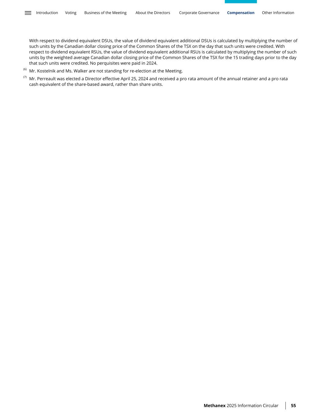 With respect to dividend equivalent DSUs, the value of dividend equivalent additional DSUs is calculated by multiplying the number of such units by the Canadian dollar closing price of the Common Shares of the TSX on the day that such units were credited. With respect to dividend equivalent RSUs, the value of dividend equivalent additional RSUs is calculated by multiplying the number of such units by the weighted average Canadian dollar closing price of the Common Shares of the TSX for the 15 trading days prior to the day that such units were credited. No perquisites were paid in 2024. (6) Mr. Kostelnik and Ms. Walker are not standing for re-election at the Meeting. (7) Mr. Perreault was elected a Director effective April 25, 2024 and received a pro rata amount of the annual retainer and a pro rata cash equivalent of the share-based award, rather than share units. Introduction Voting Business of the Meeting About the Directors Corporate Governance Compensation Other Information Methanex 2025 Information Circular 55