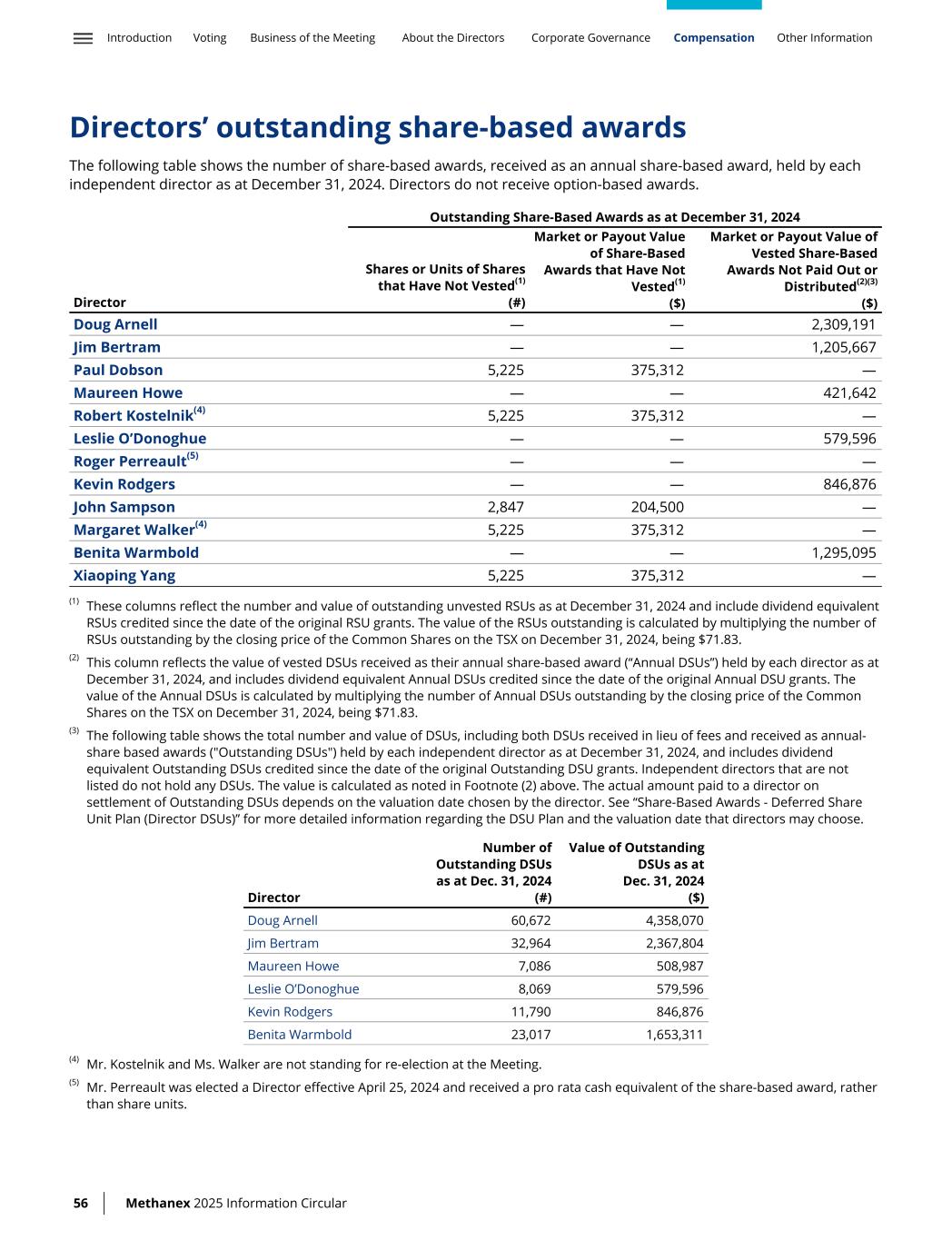 Directors’ outstanding share-based awards The following table shows the number of share-based awards, received as an annual share-based award, held by each independent director as at December 31, 2024. Directors do not receive option-based awards. Outstanding Share-Based Awards as at December 31, 2024 Director Shares or Units of Shares that Have Not Vested(1) (#) Market or Payout Value of Share-Based Awards that Have Not Vested(1) ($) Market or Payout Value of Vested Share-Based Awards Not Paid Out or Distributed(2)(3) ($) Doug Arnell — — 2,309,191 Jim Bertram — — 1,205,667 Paul Dobson 5,225 375,312 — Maureen Howe — — 421,642 Robert Kostelnik(4) 5,225 375,312 — Leslie O’Donoghue — — 579,596 Roger Perreault(5) — — — Kevin Rodgers — — 846,876 John Sampson 2,847 204,500 — Margaret Walker(4) 5,225 375,312 — Benita Warmbold — — 1,295,095 Xiaoping Yang 5,225 375,312 — (1) These columns reflect the number and value of outstanding unvested RSUs as at December 31, 2024 and include dividend equivalent RSUs credited since the date of the original RSU grants. The value of the RSUs outstanding is calculated by multiplying the number of RSUs outstanding by the closing price of the Common Shares on the TSX on December 31, 2024, being $71.83. (2) This column reflects the value of vested DSUs received as their annual share-based award (“Annual DSUs”) held by each director as at December 31, 2024, and includes dividend equivalent Annual DSUs credited since the date of the original Annual DSU grants. The value of the Annual DSUs is calculated by multiplying the number of Annual DSUs outstanding by the closing price of the Common Shares on the TSX on December 31, 2024, being $71.83. (3) The following table shows the total number and value of DSUs, including both DSUs received in lieu of fees and received as annual- share based awards ("Outstanding DSUs") held by each independent director as at December 31, 2024, and includes dividend equivalent Outstanding DSUs credited since the date of the original Outstanding DSU grants. Independent directors that are not listed do not hold any DSUs. The value is calculated as noted in Footnote (2) above. The actual amount paid to a director on settlement of Outstanding DSUs depends on the valuation date chosen by the director. See “Share-Based Awards - Deferred Share Unit Plan (Director DSUs)” for more detailed information regarding the DSU Plan and the valuation date that directors may choose. Director Number of Outstanding DSUs as at Dec. 31, 2024 (#) Value of Outstanding DSUs as at Dec. 31, 2024 ($) Doug Arnell 60,672 4,358,070 Jim Bertram 32,964 2,367,804 Maureen Howe 7,086 508,987 Leslie O’Donoghue 8,069 579,596 Kevin Rodgers 11,790 846,876 Benita Warmbold 23,017 1,653,311 (4) Mr. Kostelnik and Ms. Walker are not standing for re-election at the Meeting. (5) Mr. Perreault was elected a Director effective April 25, 2024 and received a pro rata cash equivalent of the share-based award, rather than share units. Introduction Voting Business of the Meeting About the Directors Corporate Governance Compensation Other Information 56 Methanex 2025 Information Circular