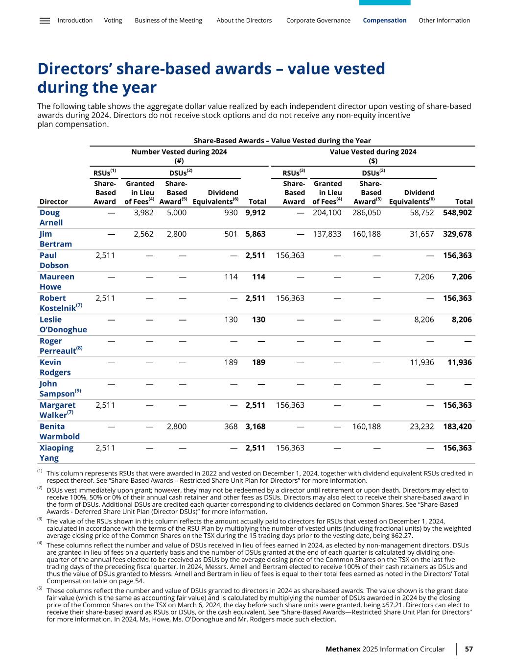 Directors’ share-based awards – value vested during the year The following table shows the aggregate dollar value realized by each independent director upon vesting of share-based awards during 2024. Directors do not receive stock options and do not receive any non-equity incentive plan compensation. Share-Based Awards – Value Vested during the Year Number Vested during 2024 (#) Value Vested during 2024 ($) RSUs(1) DSUs(2) RSUs(3) DSUs(2) Director Share- Based Award Granted in Lieu of Fees(4) Share- Based Award(5) Dividend Equivalents(6) Total Share- Based Award Granted in Lieu of Fees(4) Share- Based Award(5) Dividend Equivalents(6) Total Doug Arnell — 3,982 5,000 930 9,912 — 204,100 286,050 58,752 548,902 Jim Bertram — 2,562 2,800 501 5,863 — 137,833 160,188 31,657 329,678 Paul Dobson 2,511 — — — 2,511 156,363 — — — 156,363 Maureen Howe — — — 114 114 — — — 7,206 7,206 Robert Kostelnik(7) 2,511 — — — 2,511 156,363 — — — 156,363 Leslie O’Donoghue — — — 130 130 — — — 8,206 8,206 Roger Perreault(8) — — — — — — — — — — Kevin Rodgers — — — 189 189 — — — 11,936 11,936 John Sampson(9) — — — — — — — — — — Margaret Walker(7) 2,511 — — — 2,511 156,363 — — — 156,363 Benita Warmbold — — 2,800 368 3,168 — — 160,188 23,232 183,420 Xiaoping Yang 2,511 — — — 2,511 156,363 — — — 156,363 (1) This column represents RSUs that were awarded in 2022 and vested on December 1, 2024, together with dividend equivalent RSUs credited in respect thereof. See “Share-Based Awards – Restricted Share Unit Plan for Directors” for more information. (2) DSUs vest immediately upon grant; however, they may not be redeemed by a director until retirement or upon death. Directors may elect to receive 100%, 50% or 0% of their annual cash retainer and other fees as DSUs. Directors may also elect to receive their share-based award in the form of DSUs. Additional DSUs are credited each quarter corresponding to dividends declared on Common Shares. See “Share-Based Awards - Deferred Share Unit Plan (Director DSUs)” for more information. (3) The value of the RSUs shown in this column reflects the amount actually paid to directors for RSUs that vested on December 1, 2024, calculated in accordance with the terms of the RSU Plan by multiplying the number of vested units (including fractional units) by the weighted average closing price of the Common Shares on the TSX during the 15 trading days prior to the vesting date, being $62.27. (4) These columns reflect the number and value of DSUs received in lieu of fees earned in 2024, as elected by non-management directors. DSUs are granted in lieu of fees on a quarterly basis and the number of DSUs granted at the end of each quarter is calculated by dividing one- quarter of the annual fees elected to be received as DSUs by the average closing price of the Common Shares on the TSX on the last five trading days of the preceding fiscal quarter. In 2024, Messrs. Arnell and Bertram elected to receive 100% of their cash retainers as DSUs and thus the value of DSUs granted to Messrs. Arnell and Bertram in lieu of fees is equal to their total fees earned as noted in the Directors’ Total Compensation table on page 54. (5) These columns reflect the number and value of DSUs granted to directors in 2024 as share-based awards. The value shown is the grant date fair value (which is the same as accounting fair value) and is calculated by multiplying the number of DSUs awarded in 2024 by the closing price of the Common Shares on the TSX on March 6, 2024, the day before such share units were granted, being $57.21. Directors can elect to receive their share-based award as RSUs or DSUs, or the cash equivalent. See “Share-Based Awards—Restricted Share Unit Plan for Directors” for more information. In 2024, Ms. Howe, Ms. O'Donoghue and Mr. Rodgers made such election. Introduction Voting Business of the Meeting About the Directors Corporate Governance Compensation Other Information Methanex 2025 Information Circular 57
