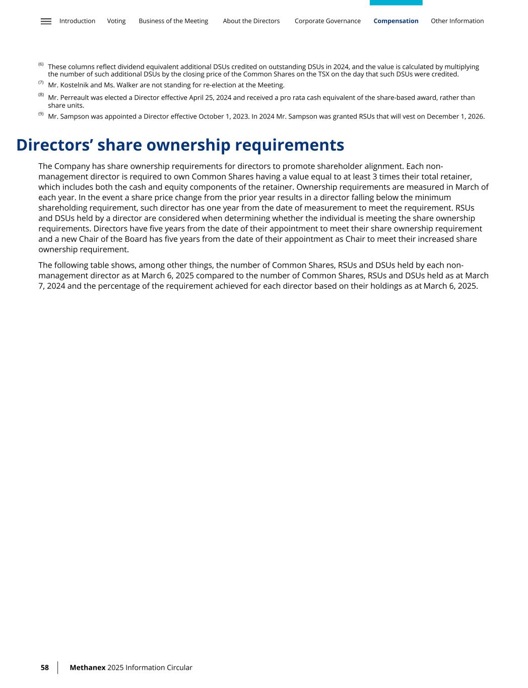 (6) These columns reflect dividend equivalent additional DSUs credited on outstanding DSUs in 2024, and the value is calculated by multiplying the number of such additional DSUs by the closing price of the Common Shares on the TSX on the day that such DSUs were credited. (7) Mr. Kostelnik and Ms. Walker are not standing for re-election at the Meeting. (8) Mr. Perreault was elected a Director effective April 25, 2024 and received a pro rata cash equivalent of the share-based award, rather than share units. (9) Mr. Sampson was appointed a Director effective October 1, 2023. In 2024 Mr. Sampson was granted RSUs that will vest on December 1, 2026. Directors’ share ownership requirements The Company has share ownership requirements for directors to promote shareholder alignment. Each non- management director is required to own Common Shares having a value equal to at least 3 times their total retainer, which includes both the cash and equity components of the retainer. Ownership requirements are measured in March of each year. In the event a share price change from the prior year results in a director falling below the minimum shareholding requirement, such director has one year from the date of measurement to meet the requirement. RSUs and DSUs held by a director are considered when determining whether the individual is meeting the share ownership requirements. Directors have five years from the date of their appointment to meet their share ownership requirement and a new Chair of the Board has five years from the date of their appointment as Chair to meet their increased share ownership requirement. The following table shows, among other things, the number of Common Shares, RSUs and DSUs held by each non- management director as at March 6, 2025 compared to the number of Common Shares, RSUs and DSUs held as at March 7, 2024 and the percentage of the requirement achieved for each director based on their holdings as at March 6, 2025. Introduction Voting Business of the Meeting About the Directors Corporate Governance Compensation Other Information 58 Methanex 2025 Information Circular