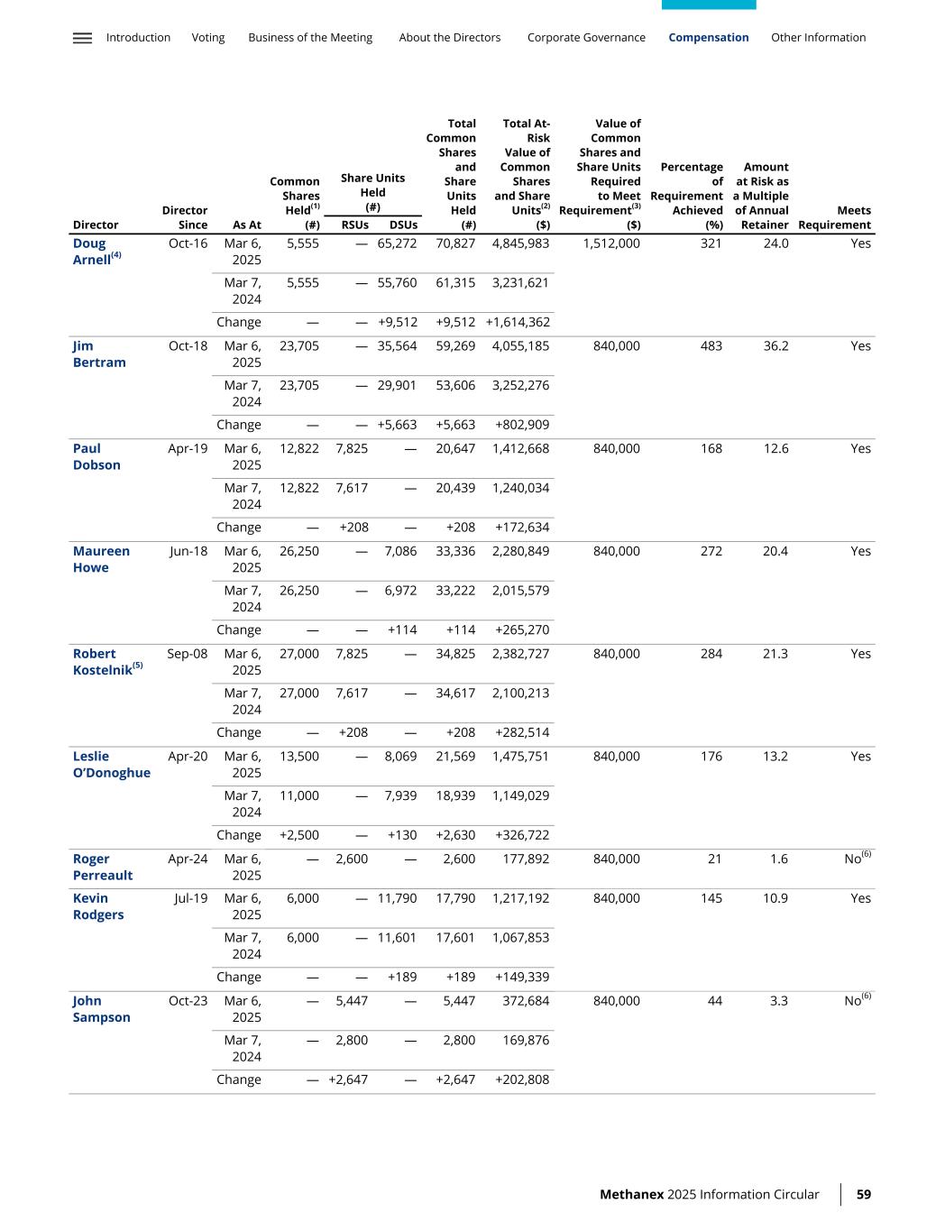 Director Director Since As At Common Shares Held(1) (#) Share Units Held (#) Total Common Shares and Share Units Held (#) Total At- Risk Value of Common Shares and Share Units(2) ($) Value of Common Shares and Share Units Required to Meet Requirement(3) ($) Percentage of Requirement Achieved (%) Amount at Risk as a Multiple of Annual Retainer Meets RequirementRSUs DSUs Doug Arnell(4) Oct-16 Mar 6, 2025 5,555 — 65,272 70,827 4,845,983 1,512,000 321 24.0 Yes Mar 7, 2024 5,555 — 55,760 61,315 3,231,621 Change — — +9,512 +9,512 +1,614,362 Jim Bertram Oct-18 Mar 6, 2025 23,705 — 35,564 59,269 4,055,185 840,000 483 36.2 Yes Mar 7, 2024 23,705 — 29,901 53,606 3,252,276 Change — — +5,663 +5,663 +802,909 Paul Dobson Apr-19 Mar 6, 2025 12,822 7,825 — 20,647 1,412,668 840,000 168 12.6 Yes Mar 7, 2024 12,822 7,617 — 20,439 1,240,034 Change — +208 — +208 +172,634 Maureen Howe Jun-18 Mar 6, 2025 26,250 — 7,086 33,336 2,280,849 840,000 272 20.4 Yes Mar 7, 2024 26,250 — 6,972 33,222 2,015,579 Change — — +114 +114 +265,270 Robert Kostelnik(5) Sep-08 Mar 6, 2025 27,000 7,825 — 34,825 2,382,727 840,000 284 21.3 Yes Mar 7, 2024 27,000 7,617 — 34,617 2,100,213 Change — +208 — +208 +282,514 Leslie O’Donoghue Apr-20 Mar 6, 2025 13,500 — 8,069 21,569 1,475,751 840,000 176 13.2 Yes Mar 7, 2024 11,000 — 7,939 18,939 1,149,029 Change +2,500 — +130 +2,630 +326,722 Roger Perreault Apr-24 Mar 6, 2025 — 2,600 — 2,600 177,892 840,000 21 1.6 No(6) Kevin Rodgers Jul-19 Mar 6, 2025 6,000 — 11,790 17,790 1,217,192 840,000 145 10.9 Yes Mar 7, 2024 6,000 — 11,601 17,601 1,067,853 Change — — +189 +189 +149,339 John Sampson Oct-23 Mar 6, 2025 — 5,447 — 5,447 372,684 840,000 44 3.3 No(6) Mar 7, 2024 — 2,800 — 2,800 169,876 Change — +2,647 — +2,647 +202,808 Introduction Voting Business of the Meeting About the Directors Corporate Governance Compensation Other Information Methanex 2025 Information Circular 59