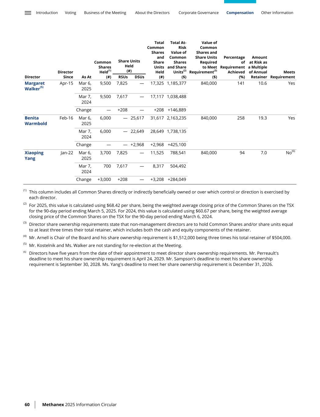 Director Director Since As At Common Shares Held(1) (#) Share Units Held (#) Total Common Shares and Share Units Held (#) Total At- Risk Value of Common Shares and Share Units(2) ($) Value of Common Shares and Share Units Required to Meet Requirement(3) ($) Percentage of Requirement Achieved (%) Amount at Risk as a Multiple of Annual Retainer Meets RequirementRSUs DSUs Margaret Walker(5) Apr-15 Mar 6, 2025 9,500 7,825 — 17,325 1,185,377 840,000 141 10.6 Yes Mar 7, 2024 9,500 7,617 — 17,117 1,038,488 Change — +208 — +208 +146,889 Benita Warmbold Feb-16 Mar 6, 2025 6,000 — 25,617 31,617 2,163,235 840,000 258 19.3 Yes Mar 7, 2024 6,000 — 22,649 28,649 1,738,135 Change — — + 2,968 +2,968 +425,100 Xiaoping Yang Jan-22 Mar 6, 2025 3,700 7,825 — 11,525 788,541 840,000 94 7.0 No(6) Mar 7, 2024 700 7,617 — 8,317 504,492 Change +3,000 +208 — +3,208 +284,049 (1) This column includes all Common Shares directly or indirectly beneficially owned or over which control or direction is exercised by each director. (2) For 2025, this value is calculated using $68.42 per share, being the weighted average closing price of the Common Shares on the TSX for the 90-day period ending March 5, 2025. For 2024, this value is calculated using $60.67 per share, being the weighted average closing price of the Common Shares on the TSX for the 90-day period ending March 6, 2024. (3) Director share ownership requirements state that non-management directors are to hold Common Shares and/or share units equal to at least three times their total retainer, which includes both the cash and equity components of the retainer. (4) Mr. Arnell is Chair of the Board and his share ownership requirement is $1,512,000 being three times his total retainer of $504,000. (5) Mr. Kostelnik and Ms. Walker are not standing for re-election at the Meeting. (6) Directors have five years from the date of their appointment to meet director share ownership requirements. Mr. Perreault's deadline to meet his share ownership requirement is April 24, 2029. Mr. Sampson's deadline to meet his share ownership requirement is September 30, 2028. Ms. Yang's deadline to meet her share ownership requirement is December 31, 2026. Introduction Voting Business of the Meeting About the Directors Corporate Governance Compensation Other Information 60 Methanex 2025 Information Circular