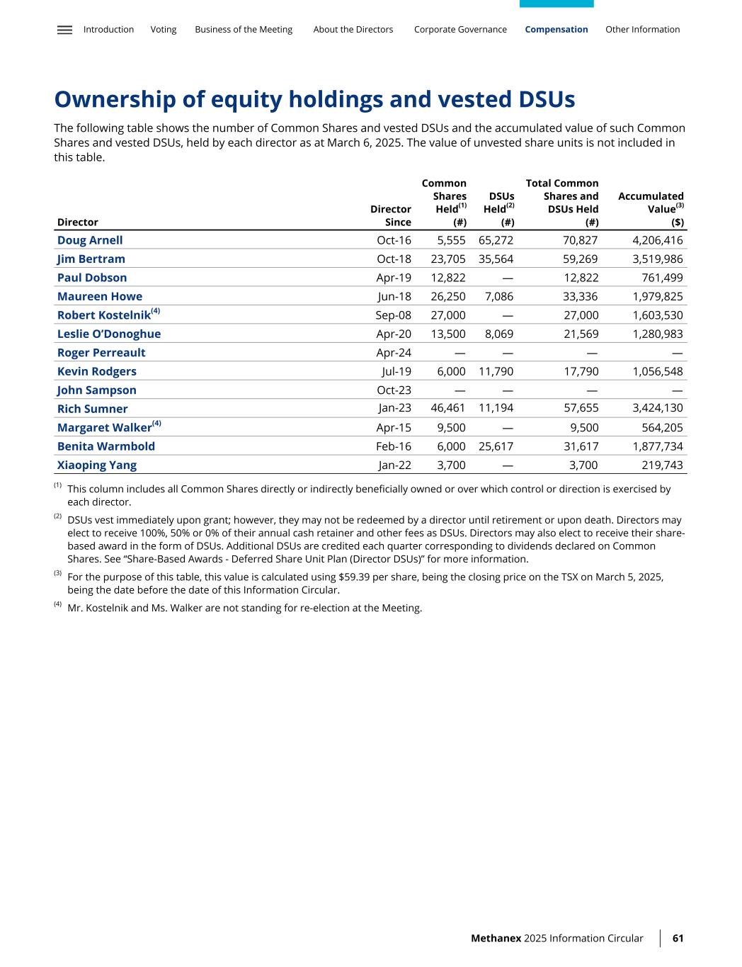 Ownership of equity holdings and vested DSUs The following table shows the number of Common Shares and vested DSUs and the accumulated value of such Common Shares and vested DSUs, held by each director as at March 6, 2025. The value of unvested share units is not included in this table. Director Director Since Common Shares Held(1) (#) DSUs Held(2) (#) Total Common Shares and DSUs Held (#) Accumulated Value(3) ($) Doug Arnell Oct-16 5,555 65,272 70,827 4,206,416 Jim Bertram Oct-18 23,705 35,564 59,269 3,519,986 Paul Dobson Apr-19 12,822 — 12,822 761,499 Maureen Howe Jun-18 26,250 7,086 33,336 1,979,825 Robert Kostelnik(4) Sep-08 27,000 — 27,000 1,603,530 Leslie O’Donoghue Apr-20 13,500 8,069 21,569 1,280,983 Roger Perreault Apr-24 — — — — Kevin Rodgers Jul-19 6,000 11,790 17,790 1,056,548 John Sampson Oct-23 — — — — Rich Sumner Jan-23 46,461 11,194 57,655 3,424,130 Margaret Walker(4) Apr-15 9,500 — 9,500 564,205 Benita Warmbold Feb-16 6,000 25,617 31,617 1,877,734 Xiaoping Yang Jan-22 3,700 — 3,700 219,743 (1) This column includes all Common Shares directly or indirectly beneficially owned or over which control or direction is exercised by each director. (2) DSUs vest immediately upon grant; however, they may not be redeemed by a director until retirement or upon death. Directors may elect to receive 100%, 50% or 0% of their annual cash retainer and other fees as DSUs. Directors may also elect to receive their share- based award in the form of DSUs. Additional DSUs are credited each quarter corresponding to dividends declared on Common Shares. See “Share-Based Awards - Deferred Share Unit Plan (Director DSUs)” for more information. (3) For the purpose of this table, this value is calculated using $59.39 per share, being the closing price on the TSX on March 5, 2025, being the date before the date of this Information Circular. (4) Mr. Kostelnik and Ms. Walker are not standing for re-election at the Meeting. Introduction Voting Business of the Meeting About the Directors Corporate Governance Compensation Other Information Methanex 2025 Information Circular 61