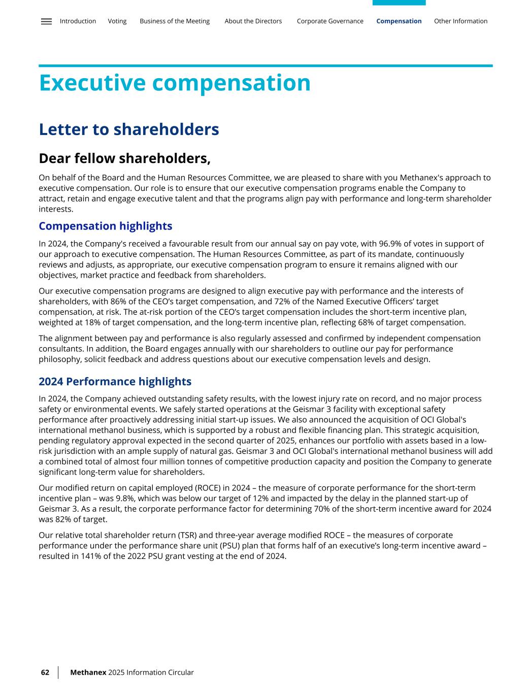 Executive compensation Letter to shareholders Dear fellow shareholders, On behalf of the Board and the Human Resources Committee, we are pleased to share with you Methanex's approach to executive compensation. Our role is to ensure that our executive compensation programs enable the Company to attract, retain and engage executive talent and that the programs align pay with performance and long-term shareholder interests. Compensation highlights In 2024, the Company's received a favourable result from our annual say on pay vote, with 96.9% of votes in support of our approach to executive compensation. The Human Resources Committee, as part of its mandate, continuously reviews and adjusts, as appropriate, our executive compensation program to ensure it remains aligned with our objectives, market practice and feedback from shareholders. Our executive compensation programs are designed to align executive pay with performance and the interests of shareholders, with 86% of the CEO’s target compensation, and 72% of the Named Executive Officers’ target compensation, at risk. The at-risk portion of the CEO’s target compensation includes the short-term incentive plan, weighted at 18% of target compensation, and the long-term incentive plan, reflecting 68% of target compensation. The alignment between pay and performance is also regularly assessed and confirmed by independent compensation consultants. In addition, the Board engages annually with our shareholders to outline our pay for performance philosophy, solicit feedback and address questions about our executive compensation levels and design. 2024 Performance highlights In 2024, the Company achieved outstanding safety results, with the lowest injury rate on record, and no major process safety or environmental events. We safely started operations at the Geismar 3 facility with exceptional safety performance after proactively addressing initial start-up issues. We also announced the acquisition of OCI Global's international methanol business, which is supported by a robust and flexible financing plan. This strategic acquisition, pending regulatory approval expected in the second quarter of 2025, enhances our portfolio with assets based in a low- risk jurisdiction with an ample supply of natural gas. Geismar 3 and OCI Global's international methanol business will add a combined total of almost four million tonnes of competitive production capacity and position the Company to generate significant long-term value for shareholders. Our modified return on capital employed (ROCE) in 2024 – the measure of corporate performance for the short-term incentive plan – was 9.8%, which was below our target of 12% and impacted by the delay in the planned start-up of Geismar 3. As a result, the corporate performance factor for determining 70% of the short-term incentive award for 2024 was 82% of target. Our relative total shareholder return (TSR) and three-year average modified ROCE – the measures of corporate performance under the performance share unit (PSU) plan that forms half of an executive’s long-term incentive award – resulted in 141% of the 2022 PSU grant vesting at the end of 2024. Introduction Voting Business of the Meeting About the Directors Corporate Governance Compensation Other Information 62 Methanex 2025 Information Circular