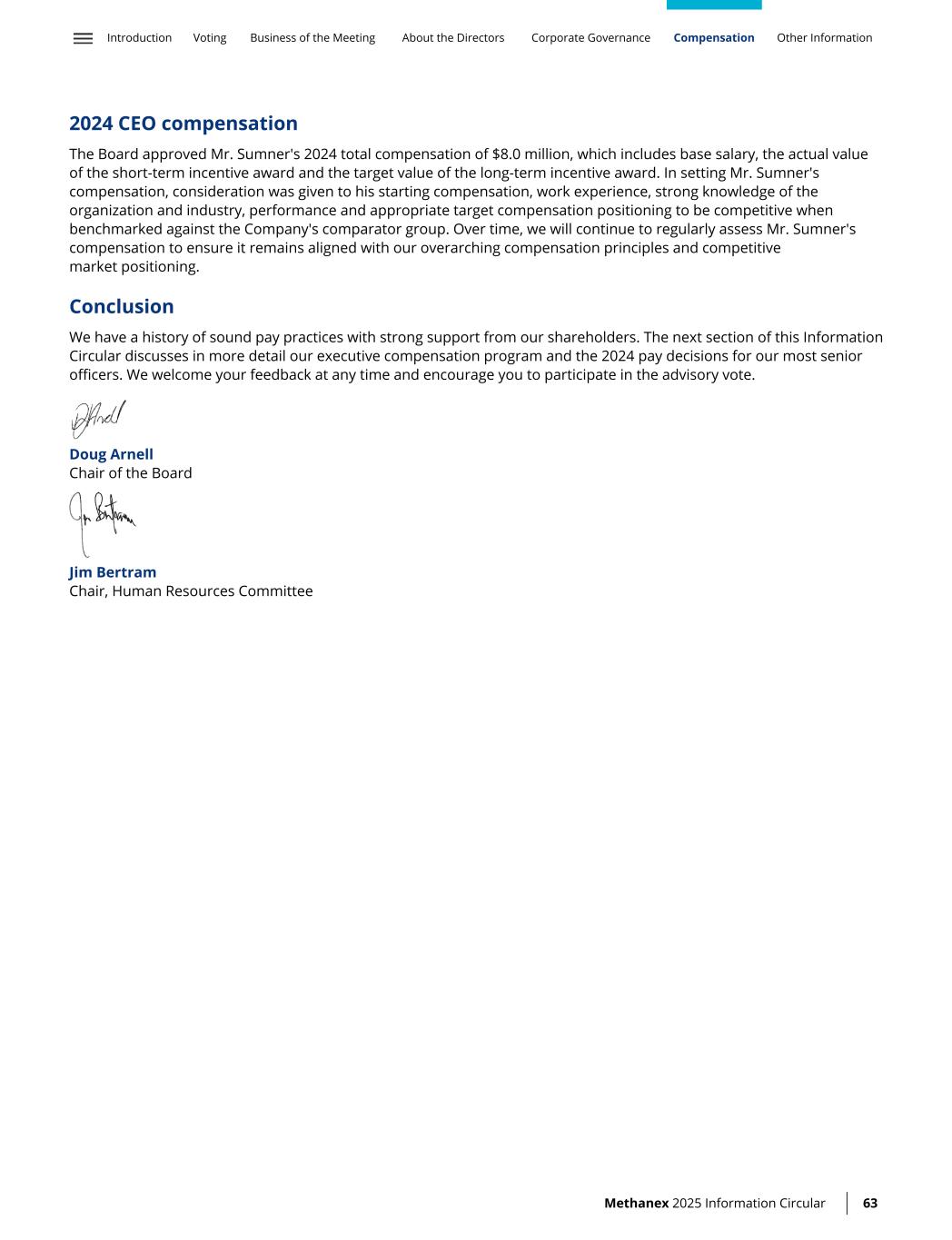 2024 CEO compensation The Board approved Mr. Sumner's 2024 total compensation of $8.0 million, which includes base salary, the actual value of the short-term incentive award and the target value of the long-term incentive award. In setting Mr. Sumner's compensation, consideration was given to his starting compensation, work experience, strong knowledge of the organization and industry, performance and appropriate target compensation positioning to be competitive when benchmarked against the Company's comparator group. Over time, we will continue to regularly assess Mr. Sumner's compensation to ensure it remains aligned with our overarching compensation principles and competitive market positioning. Conclusion We have a history of sound pay practices with strong support from our shareholders. The next section of this Information Circular discusses in more detail our executive compensation program and the 2024 pay decisions for our most senior officers. We welcome your feedback at any time and encourage you to participate in the advisory vote. Doug Arnell Chair of the Board Jim Bertram Chair, Human Resources Committee Introduction Voting Business of the Meeting About the Directors Corporate Governance Compensation Other Information Methanex 2025 Information Circular 63