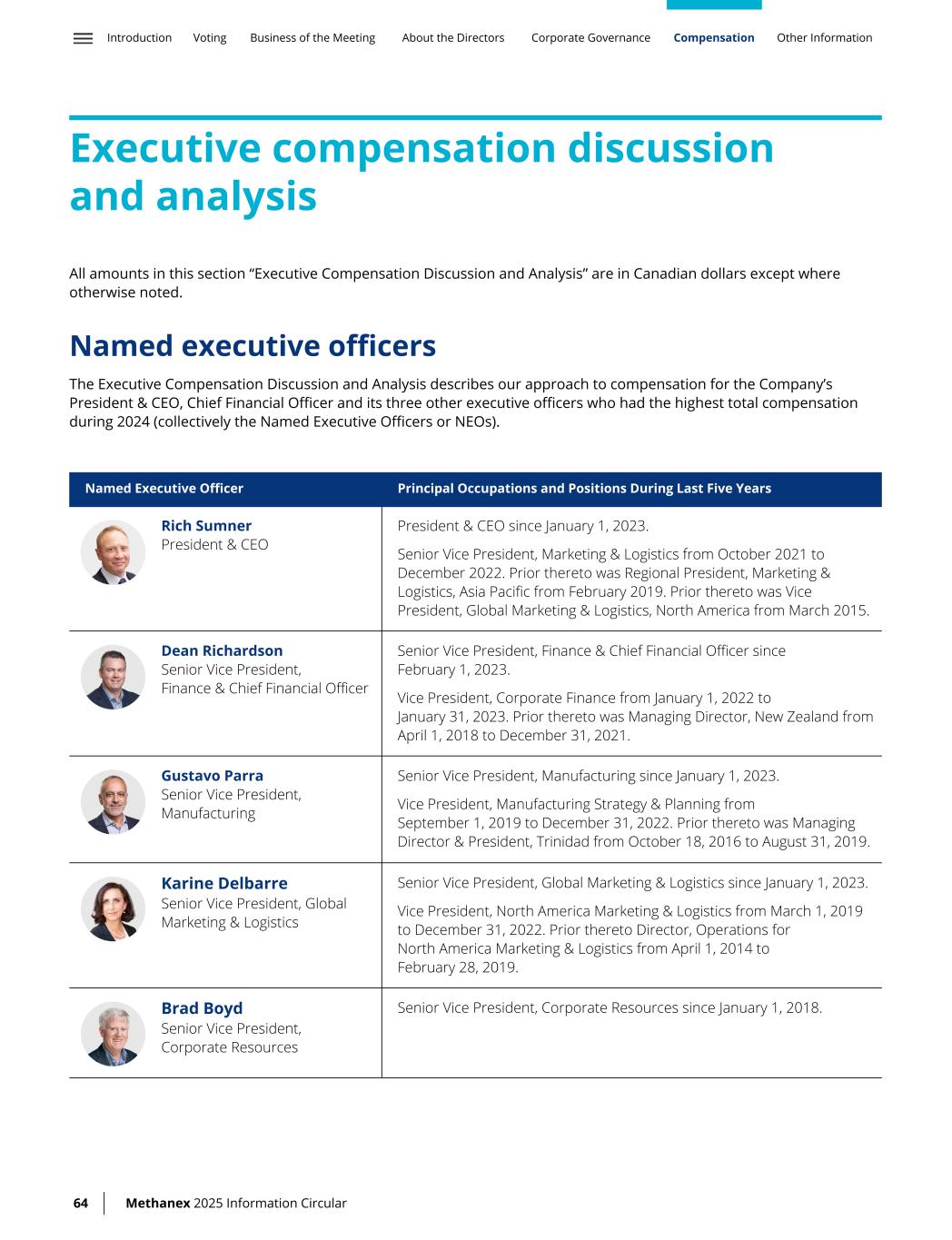 Executive compensation discussion and analysis All amounts in this section “Executive Compensation Discussion and Analysis” are in Canadian dollars except where otherwise noted. Named executive officers The Executive Compensation Discussion and Analysis describes our approach to compensation for the Company’s President & CEO, Chief Financial Officer and its three other executive officers who had the highest total compensation during 2024 (collectively the Named Executive Officers or NEOs). Named Executive Officer Principal Occupations and Positions During Last Five Years Rich Sumner President & CEO President & CEO since January 1, 2023. Senior Vice President, Marketing & Logistics from October 2021 to December 2022. Prior thereto was Regional President, Marketing & Logistics, Asia Pacific from February 2019. Prior thereto was Vice President, Global Marketing & Logistics, North America from March 2015. Dean Richardson Senior Vice President, Finance & Chief Financial Officer Senior Vice President, Finance & Chief Financial Officer since February 1, 2023. Vice President, Corporate Finance from January 1, 2022 to January 31, 2023. Prior thereto was Managing Director, New Zealand from April 1, 2018 to December 31, 2021. Gustavo Parra Senior Vice President, Manufacturing Senior Vice President, Manufacturing since January 1, 2023. Vice President, Manufacturing Strategy & Planning from September 1, 2019 to December 31, 2022. Prior thereto was Managing Director & President, Trinidad from October 18, 2016 to August 31, 2019. Karine Delbarre Senior Vice President, Global Marketing & Logistics Senior Vice President, Global Marketing & Logistics since January 1, 2023. Vice President, North America Marketing & Logistics from March 1, 2019 to December 31, 2022. Prior thereto Director, Operations for North America Marketing & Logistics from April 1, 2014 to February 28, 2019. Brad Boyd Senior Vice President, Corporate Resources Senior Vice President, Corporate Resources since January 1, 2018. Introduction Voting Business of the Meeting About the Directors Corporate Governance Compensation Other Information 64 Methanex 2025 Information Circular