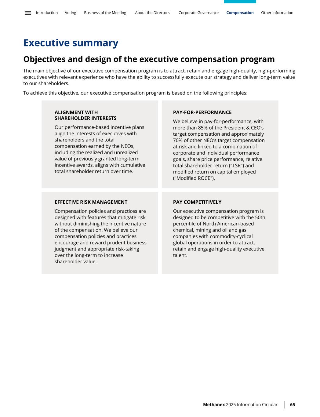 Executive summary Objectives and design of the executive compensation program The main objective of our executive compensation program is to attract, retain and engage high-quality, high-performing executives with relevant experience who have the ability to successfully execute our strategy and deliver long-term value to our shareholders. To achieve this objective, our executive compensation program is based on the following principles: ALIGNMENT WITH SHAREHOLDER INTERESTS Our performance-based incentive plans align the interests of executives with shareholders and the total compensation earned by the NEOs, including the realized and unrealized value of previously granted long-term incentive awards, aligns with cumulative total shareholder return over time. PAY-FOR-PERFORMANCE We believe in pay-for-performance, with more than 85% of the President & CEO’s target compensation and approximately 70% of other NEO’s target compensation at risk and linked to a combination of corporate and individual performance goals, share price performance, relative total shareholder return ("TSR") and modified return on capital employed ("Modified ROCE"). EFFECTIVE RISK MANAGEMENT Compensation policies and practices are designed with features that mitigate risk without diminishing the incentive nature of the compensation. We believe our compensation policies and practices encourage and reward prudent business judgment and appropriate risk-taking over the long-term to increase shareholder value. PAY COMPETITIVELY Our executive compensation program is designed to be competitive with the 50th percentile of North American-based chemical, mining and oil and gas companies with commodity-cyclical global operations in order to attract, retain and engage high-quality executive talent. Introduction Voting Business of the Meeting About the Directors Corporate Governance Compensation Other Information Methanex 2025 Information Circular 65
