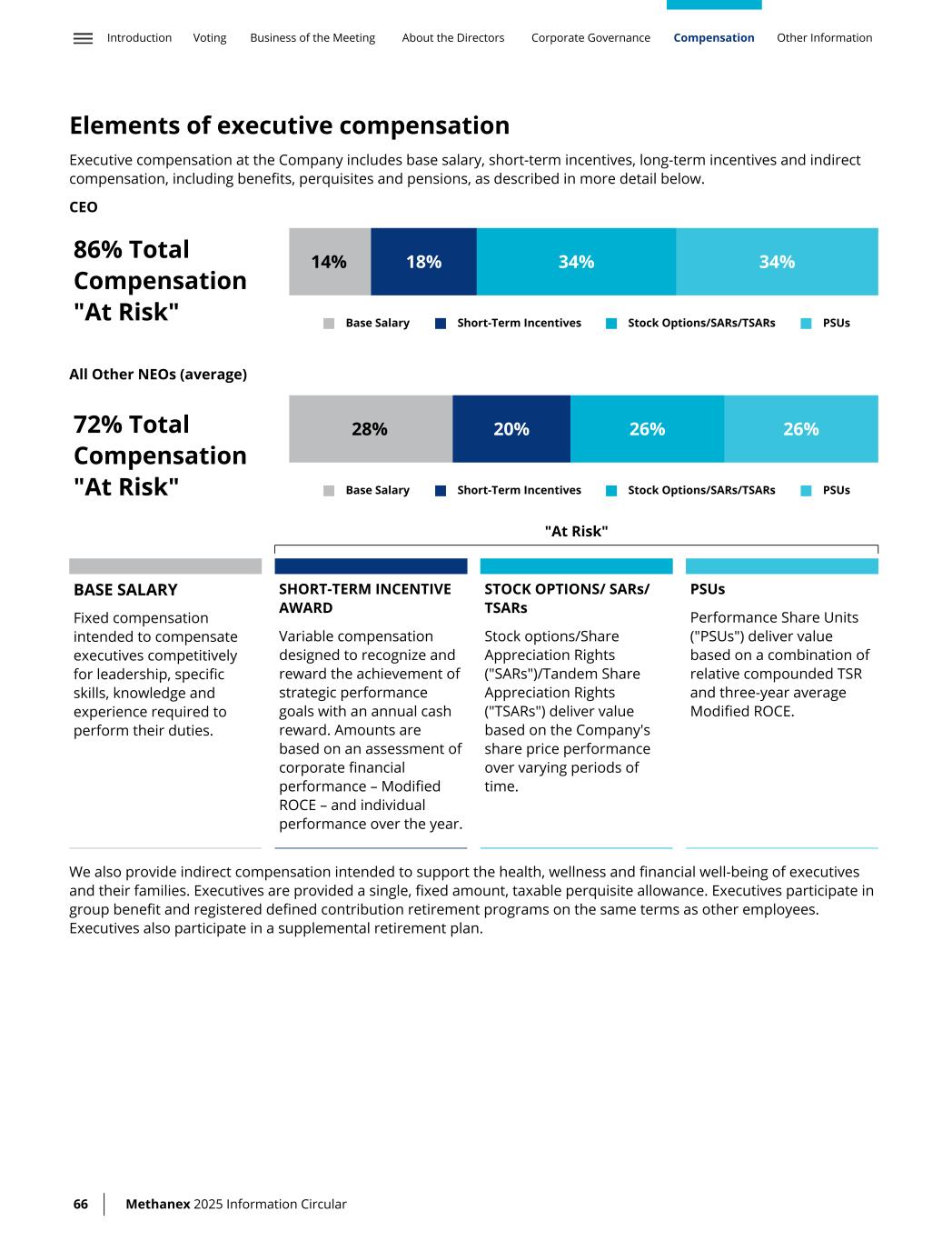 Elements of executive compensation Executive compensation at the Company includes base salary, short-term incentives, long-term incentives and indirect compensation, including benefits, perquisites and pensions, as described in more detail below. CEO 86% Total Compensation "At Risk" 14% 18% 34% 34% Base Salary Short-Term Incentives Stock Options/SARs/TSARs PSUs All Other NEOs (average) 72% Total Compensation "At Risk" 28% 20% 26% 26% Base Salary Short-Term Incentives Stock Options/SARs/TSARs PSUs "At Risk" BASE SALARY Fixed compensation intended to compensate executives competitively for leadership, specific skills, knowledge and experience required to perform their duties. SHORT-TERM INCENTIVE AWARD Variable compensation designed to recognize and reward the achievement of strategic performance goals with an annual cash reward. Amounts are based on an assessment of corporate financial performance – Modified ROCE – and individual performance over the year. STOCK OPTIONS/ SARs/ TSARs Stock options/Share Appreciation Rights ("SARs")/Tandem Share Appreciation Rights ("TSARs") deliver value based on the Company's share price performance over varying periods of time. PSUs Performance Share Units ("PSUs") deliver value based on a combination of relative compounded TSR and three-year average Modified ROCE. We also provide indirect compensation intended to support the health, wellness and financial well-being of executives and their families. Executives are provided a single, fixed amount, taxable perquisite allowance. Executives participate in group benefit and registered defined contribution retirement programs on the same terms as other employees. Executives also participate in a supplemental retirement plan. Introduction Voting Business of the Meeting About the Directors Corporate Governance Compensation Other Information 66 Methanex 2025 Information Circular