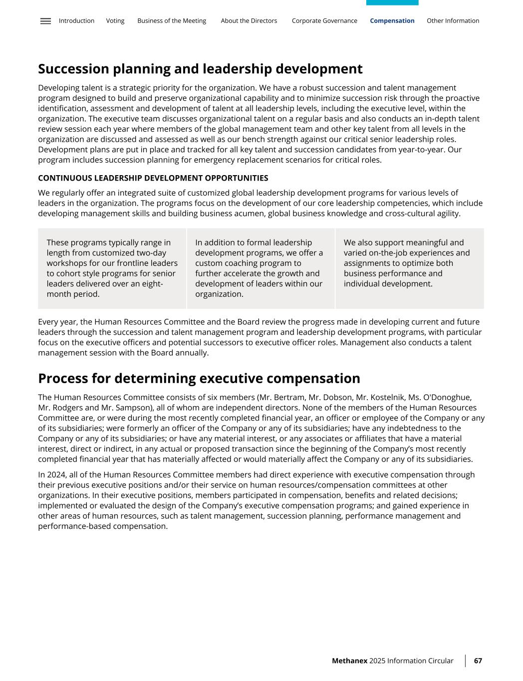 Succession planning and leadership development Developing talent is a strategic priority for the organization. We have a robust succession and talent management program designed to build and preserve organizational capability and to minimize succession risk through the proactive identification, assessment and development of talent at all leadership levels, including the executive level, within the organization. The executive team discusses organizational talent on a regular basis and also conducts an in-depth talent review session each year where members of the global management team and other key talent from all levels in the organization are discussed and assessed as well as our bench strength against our critical senior leadership roles. Development plans are put in place and tracked for all key talent and succession candidates from year-to-year. Our program includes succession planning for emergency replacement scenarios for critical roles. CONTINUOUS LEADERSHIP DEVELOPMENT OPPORTUNITIES We regularly offer an integrated suite of customized global leadership development programs for various levels of leaders in the organization. The programs focus on the development of our core leadership competencies, which include developing management skills and building business acumen, global business knowledge and cross-cultural agility. These programs typically range in length from customized two-day workshops for our frontline leaders to cohort style programs for senior leaders delivered over an eight- month period. In addition to formal leadership development programs, we offer a custom coaching program to further accelerate the growth and development of leaders within our organization. We also support meaningful and varied on-the-job experiences and assignments to optimize both business performance and individual development. Every year, the Human Resources Committee and the Board review the progress made in developing current and future leaders through the succession and talent management program and leadership development programs, with particular focus on the executive officers and potential successors to executive officer roles. Management also conducts a talent management session with the Board annually. Process for determining executive compensation The Human Resources Committee consists of six members (Mr. Bertram, Mr. Dobson, Mr. Kostelnik, Ms. O'Donoghue, Mr. Rodgers and Mr. Sampson), all of whom are independent directors. None of the members of the Human Resources Committee are, or were during the most recently completed financial year, an officer or employee of the Company or any of its subsidiaries; were formerly an officer of the Company or any of its subsidiaries; have any indebtedness to the Company or any of its subsidiaries; or have any material interest, or any associates or affiliates that have a material interest, direct or indirect, in any actual or proposed transaction since the beginning of the Company’s most recently completed financial year that has materially affected or would materially affect the Company or any of its subsidiaries. In 2024, all of the Human Resources Committee members had direct experience with executive compensation through their previous executive positions and/or their service on human resources/compensation committees at other organizations. In their executive positions, members participated in compensation, benefits and related decisions; implemented or evaluated the design of the Company’s executive compensation programs; and gained experience in other areas of human resources, such as talent management, succession planning, performance management and performance-based compensation. Introduction Voting Business of the Meeting About the Directors Corporate Governance Compensation Other Information Methanex 2025 Information Circular 67
