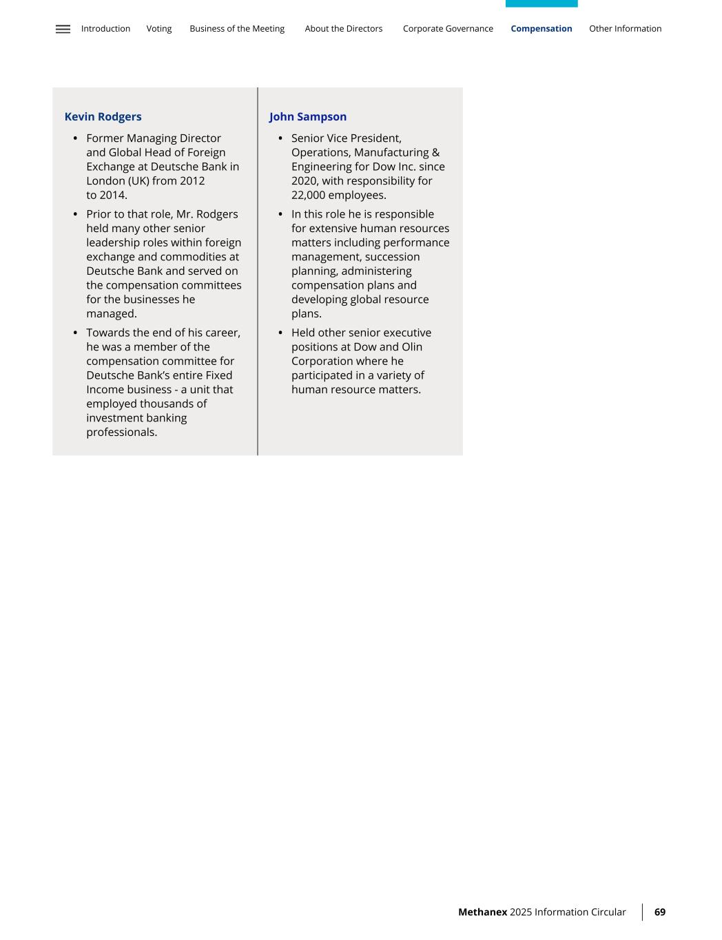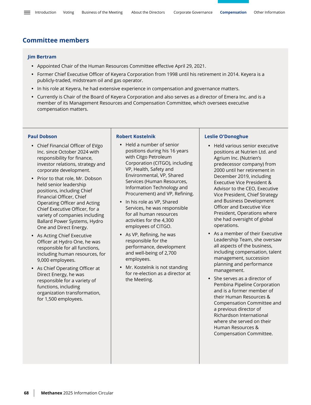 Committee members Jim Bertram • Appointed Chair of the Human Resources Committee effective April 29, 2021. • Former Chief Executive Officer of Keyera Corporation from 1998 until his retirement in 2014. Keyera is a publicly-traded, midstream oil and gas operator. • In his role at Keyera, he had extensive experience in compensation and governance matters. • Currently is Chair of the Board of Keyera Corporation and also serves as a director of Emera Inc. and is a member of its Management Resources and Compensation Committee, which oversees executive compensation matters. Paul Dobson • Chief Financial Officer of EVgo Inc. since October 2024 with responsibility for finance, investor relations, strategy and corporate development. • Prior to that role, Mr. Dobson held senior leadership positions, including Chief Financial Officer, Chief Operating Officer and Acting Chief Executive Officer, for a variety of companies including Ballard Power Systems, Hydro One and Direct Energy. • As Acting Chief Executive Officer at Hydro One, he was responsible for all functions, including human resources, for 9,000 employees. • As Chief Operating Officer at Direct Energy, he was responsible for a variety of functions, including organization transformation, for 1,500 employees. Robert Kostelnik • Held a number of senior positions during his 16 years with Citgo Petroleum Corporation (CITGO), including VP, Health, Safety and Environmental, VP, Shared Services (Human Resources, Information Technology and Procurement) and VP, Refining. • In his role as VP, Shared Services, he was responsible for all human resources activities for the 4,300 employees of CITGO. • As VP, Refining, he was responsible for the performance, development and well-being of 2,700 employees. • Mr. Kostelnik is not standing for re-election as a director at the Meeting. Leslie O'Donoghue • Held various senior executive positions at Nutrien Ltd. and Agrium Inc. (Nutrien’s predecessor company) from 2000 until her retirement in December 2019, including Executive Vice President & Advisor to the CEO, Executive Vice President, Chief Strategy and Business Development Officer and Executive Vice President, Operations where she had oversight of global operations. • As a member of their Executive Leadership Team, she oversaw all aspects of the business, including compensation, talent management, succession planning and performance management. • She serves as a director of Pembina Pipeline Corporation and is a former member of their Human Resources & Compensation Committee and a previous director of Richardson International where she served on their Human Resources & Compensation Committee. Introduction Voting Business of the Meeting About the Directors Corporate Governance Compensation Other Information 68 Methanex 2025 Information Circular