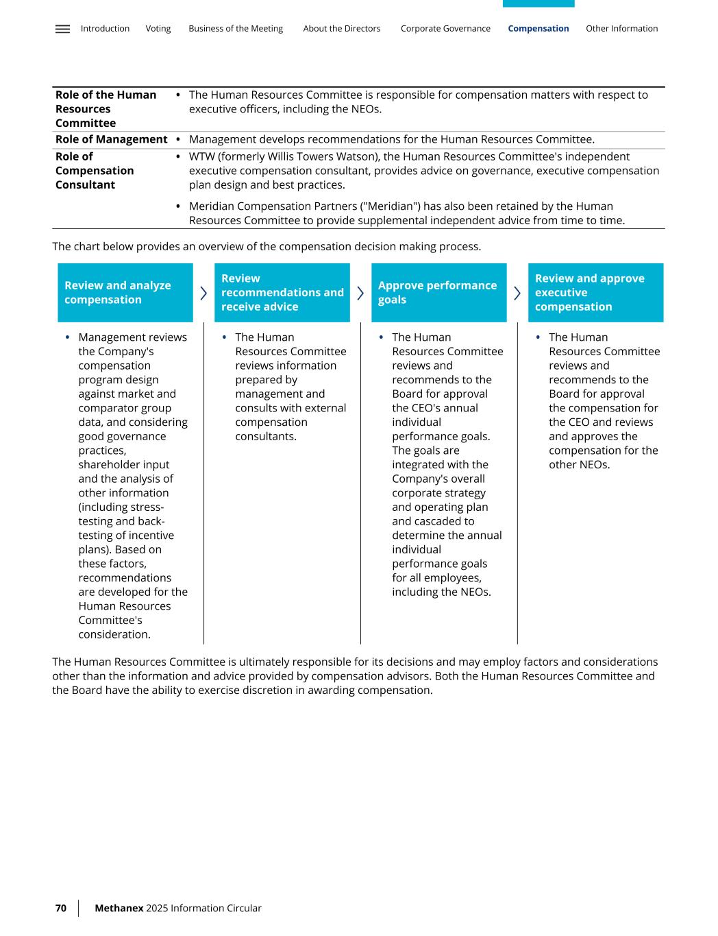 Role of the Human Resources Committee • The Human Resources Committee is responsible for compensation matters with respect to executive officers, including the NEOs. Role of Management • Management develops recommendations for the Human Resources Committee. Role of Compensation Consultant • WTW (formerly Willis Towers Watson), the Human Resources Committee's independent executive compensation consultant, provides advice on governance, executive compensation plan design and best practices. • Meridian Compensation Partners ("Meridian") has also been retained by the Human Resources Committee to provide supplemental independent advice from time to time. The chart below provides an overview of the compensation decision making process. Review and analyze compensation Review recommendations and receive advice Approve performance goals Review and approve executive compensation • Management reviews the Company's compensation program design against market and comparator group data, and considering good governance practices, shareholder input and the analysis of other information (including stress- testing and back- testing of incentive plans). Based on these factors, recommendations are developed for the Human Resources Committee's consideration. • The Human Resources Committee reviews information prepared by management and consults with external compensation consultants. • The Human Resources Committee reviews and recommends to the Board for approval the CEO's annual individual performance goals. The goals are integrated with the Company's overall corporate strategy and operating plan and cascaded to determine the annual individual performance goals for all employees, including the NEOs. • The Human Resources Committee reviews and recommends to the Board for approval the compensation for the CEO and reviews and approves the compensation for the other NEOs. The Human Resources Committee is ultimately responsible for its decisions and may employ factors and considerations other than the information and advice provided by compensation advisors. Both the Human Resources Committee and the Board have the ability to exercise discretion in awarding compensation. Introduction Voting Business of the Meeting About the Directors Corporate Governance Compensation Other Information 70 Methanex 2025 Information Circular