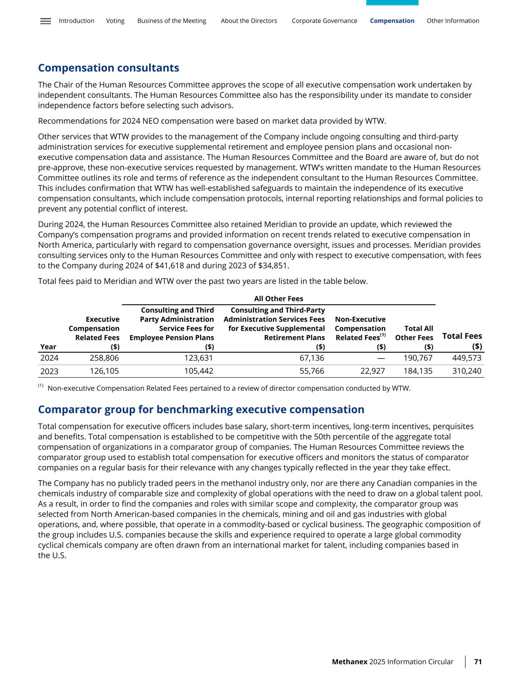 Compensation consultants The Chair of the Human Resources Committee approves the scope of all executive compensation work undertaken by independent consultants. The Human Resources Committee also has the responsibility under its mandate to consider independence factors before selecting such advisors. Recommendations for 2024 NEO compensation were based on market data provided by WTW. Other services that WTW provides to the management of the Company include ongoing consulting and third-party administration services for executive supplemental retirement and employee pension plans and occasional non- executive compensation data and assistance. The Human Resources Committee and the Board are aware of, but do not pre-approve, these non-executive services requested by management. WTW’s written mandate to the Human Resources Committee outlines its role and terms of reference as the independent consultant to the Human Resources Committee. This includes confirmation that WTW has well-established safeguards to maintain the independence of its executive compensation consultants, which include compensation protocols, internal reporting relationships and formal policies to prevent any potential conflict of interest. During 2024, the Human Resources Committee also retained Meridian to provide an update, which reviewed the Company’s compensation programs and provided information on recent trends related to executive compensation in North America, particularly with regard to compensation governance oversight, issues and processes. Meridian provides consulting services only to the Human Resources Committee and only with respect to executive compensation, with fees to the Company during 2024 of $41,618 and during 2023 of $34,851. Total fees paid to Meridian and WTW over the past two years are listed in the table below. All Other Fees Year Executive Compensation Related Fees ($) Consulting and Third Party Administration Service Fees for Employee Pension Plans ($) Consulting and Third-Party Administration Services Fees for Executive Supplemental Retirement Plans ($) Non-Executive Compensation Related Fees(1) ($) Total All Other Fees ($) Total Fees ($) 2024 258,806 123,631 67,136 — 190,767 449,573 2023 126,105 105,442 55,766 22,927 184,135 310,240 (1) Non-executive Compensation Related Fees pertained to a review of director compensation conducted by WTW. Comparator group for benchmarking executive compensation Total compensation for executive officers includes base salary, short-term incentives, long-term incentives, perquisites and benefits. Total compensation is established to be competitive with the 50th percentile of the aggregate total compensation of organizations in a comparator group of companies. The Human Resources Committee reviews the comparator group used to establish total compensation for executive officers and monitors the status of comparator companies on a regular basis for their relevance with any changes typically reflected in the year they take effect. The Company has no publicly traded peers in the methanol industry only, nor are there any Canadian companies in the chemicals industry of comparable size and complexity of global operations with the need to draw on a global talent pool. As a result, in order to find the companies and roles with similar scope and complexity, the comparator group was selected from North American-based companies in the chemicals, mining and oil and gas industries with global operations, and, where possible, that operate in a commodity-based or cyclical business. The geographic composition of the group includes U.S. companies because the skills and experience required to operate a large global commodity cyclical chemicals company are often drawn from an international market for talent, including companies based in the U.S. Introduction Voting Business of the Meeting About the Directors Corporate Governance Compensation Other Information Methanex 2025 Information Circular 71