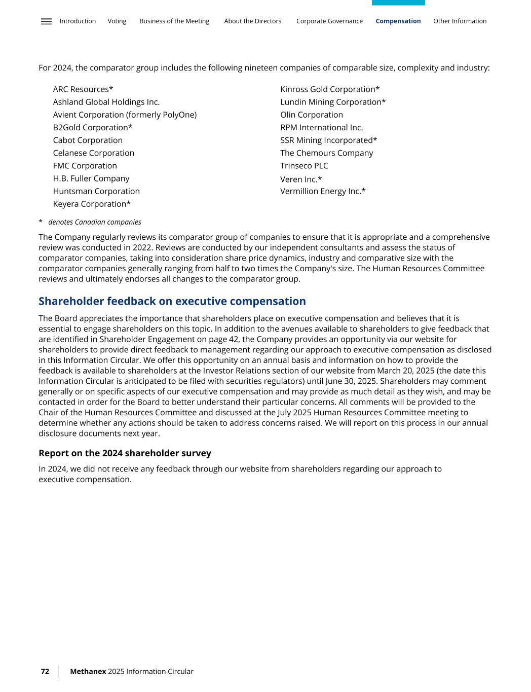 For 2024, the comparator group includes the following nineteen companies of comparable size, complexity and industry: ARC Resources* Kinross Gold Corporation* Ashland Global Holdings Inc. Lundin Mining Corporation* Avient Corporation (formerly PolyOne) Olin Corporation B2Gold Corporation* RPM International Inc. Cabot Corporation SSR Mining Incorporated* Celanese Corporation The Chemours Company FMC Corporation Trinseco PLC H.B. Fuller Company Veren Inc.* Huntsman Corporation Vermillion Energy Inc.* Keyera Corporation* * denotes Canadian companies The Company regularly reviews its comparator group of companies to ensure that it is appropriate and a comprehensive review was conducted in 2022. Reviews are conducted by our independent consultants and assess the status of comparator companies, taking into consideration share price dynamics, industry and comparative size with the comparator companies generally ranging from half to two times the Company's size. The Human Resources Committee reviews and ultimately endorses all changes to the comparator group. Shareholder feedback on executive compensation The Board appreciates the importance that shareholders place on executive compensation and believes that it is essential to engage shareholders on this topic. In addition to the avenues available to shareholders to give feedback that are identified in Shareholder Engagement on page 42, the Company provides an opportunity via our website for shareholders to provide direct feedback to management regarding our approach to executive compensation as disclosed in this Information Circular. We offer this opportunity on an annual basis and information on how to provide the feedback is available to shareholders at the Investor Relations section of our website from March 20, 2025 (the date this Information Circular is anticipated to be filed with securities regulators) until June 30, 2025. Shareholders may comment generally or on specific aspects of our executive compensation and may provide as much detail as they wish, and may be contacted in order for the Board to better understand their particular concerns. All comments will be provided to the Chair of the Human Resources Committee and discussed at the July 2025 Human Resources Committee meeting to determine whether any actions should be taken to address concerns raised. We will report on this process in our annual disclosure documents next year. Report on the 2024 shareholder survey In 2024, we did not receive any feedback through our website from shareholders regarding our approach to executive compensation. Introduction Voting Business of the Meeting About the Directors Corporate Governance Compensation Other Information 72 Methanex 2025 Information Circular