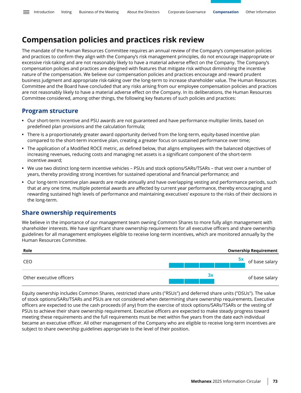 Compensation policies and practices risk review The mandate of the Human Resources Committee requires an annual review of the Company’s compensation policies and practices to confirm they align with the Company’s risk management principles, do not encourage inappropriate or excessive risk-taking and are not reasonably likely to have a material adverse effect on the Company. The Company’s compensation policies and practices are designed with features that mitigate risk without diminishing the incentive nature of the compensation. We believe our compensation policies and practices encourage and reward prudent business judgment and appropriate risk-taking over the long-term to increase shareholder value. The Human Resources Committee and the Board have concluded that any risks arising from our employee compensation policies and practices are not reasonably likely to have a material adverse effect on the Company. In its deliberations, the Human Resources Committee considered, among other things, the following key features of such policies and practices: Program structure • Our short-term incentive and PSU awards are not guaranteed and have performance multiplier limits, based on predefined plan provisions and the calculation formula; • There is a proportionately greater award opportunity derived from the long-term, equity-based incentive plan compared to the short-term incentive plan, creating a greater focus on sustained performance over time; • The application of a Modified ROCE metric, as defined below, that aligns employees with the balanced objectives of increasing revenues, reducing costs and managing net assets is a significant component of the short-term incentive award; • We use two distinct long-term incentive vehicles – PSUs and stock options/SARs/TSARs – that vest over a number of years, thereby providing strong incentives for sustained operational and financial performance; and • Our long-term incentive plan awards are made annually and have overlapping vesting and performance periods, such that at any one time, multiple potential awards are affected by current year performance, thereby encouraging and rewarding sustained high levels of performance and maintaining executives’ exposure to the risks of their decisions in the long-term. Share ownership requirements We believe in the importance of our management team owning Common Shares to more fully align management with shareholder interests. We have significant share ownership requirements for all executive officers and share ownership guidelines for all management employees eligible to receive long-term incentives, which are monitored annually by the Human Resources Committee. Role Ownership Requirement CEO 5x of base salary Other executive officers 3x of base salary Equity ownership includes Common Shares, restricted share units ("RSUs") and deferred share units ("DSUs"). The value of stock options/SARs/TSARs and PSUs are not considered when determining share ownership requirements. Executive officers are expected to use the cash proceeds (if any) from the exercise of stock options/SARs/TSARs or the vesting of PSUs to achieve their share ownership requirement. Executive officers are expected to make steady progress toward meeting these requirements and the full requirements must be met within five years from the date each individual became an executive officer. All other management of the Company who are eligible to receive long-term incentives are subject to share ownership guidelines appropriate to the level of their position. Introduction Voting Business of the Meeting About the Directors Corporate Governance Compensation Other Information Methanex 2025 Information Circular 73