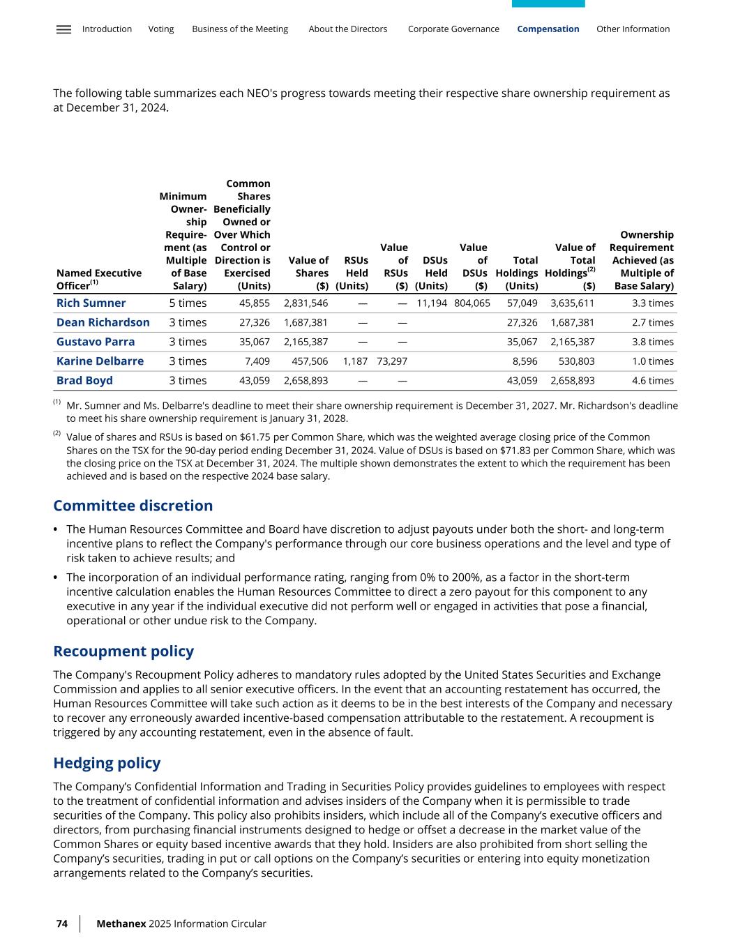 The following table summarizes each NEO's progress towards meeting their respective share ownership requirement as at December 31, 2024. Named Executive Officer(1) Minimum Owner- ship Require- ment (as Multiple of Base Salary) Common Shares Beneficially Owned or Over Which Control or Direction is Exercised (Units) Value of Shares ($) RSUs Held (Units) Value of RSUs ($) DSUs Held (Units) Value of DSUs ($) Total Holdings (Units) Value of Total Holdings(2) ($) Ownership Requirement Achieved (as Multiple of Base Salary) Rich Sumner 5 times 45,855 2,831,546 — — 11,194 804,065 57,049 3,635,611 3.3 times Dean Richardson 3 times 27,326 1,687,381 — — 27,326 1,687,381 2.7 times Gustavo Parra 3 times 35,067 2,165,387 — — 35,067 2,165,387 3.8 times Karine Delbarre 3 times 7,409 457,506 1,187 73,297 8,596 530,803 1.0 times Brad Boyd 3 times 43,059 2,658,893 — — 43,059 2,658,893 4.6 times (1) Mr. Sumner and Ms. Delbarre's deadline to meet their share ownership requirement is December 31, 2027. Mr. Richardson's deadline to meet his share ownership requirement is January 31, 2028. (2) Value of shares and RSUs is based on $61.75 per Common Share, which was the weighted average closing price of the Common Shares on the TSX for the 90-day period ending December 31, 2024. Value of DSUs is based on $71.83 per Common Share, which was the closing price on the TSX at December 31, 2024. The multiple shown demonstrates the extent to which the requirement has been achieved and is based on the respective 2024 base salary. Committee discretion • The Human Resources Committee and Board have discretion to adjust payouts under both the short- and long-term incentive plans to reflect the Company's performance through our core business operations and the level and type of risk taken to achieve results; and • The incorporation of an individual performance rating, ranging from 0% to 200%, as a factor in the short-term incentive calculation enables the Human Resources Committee to direct a zero payout for this component to any executive in any year if the individual executive did not perform well or engaged in activities that pose a financial, operational or other undue risk to the Company. Recoupment policy The Company's Recoupment Policy adheres to mandatory rules adopted by the United States Securities and Exchange Commission and applies to all senior executive officers. In the event that an accounting restatement has occurred, the Human Resources Committee will take such action as it deems to be in the best interests of the Company and necessary to recover any erroneously awarded incentive-based compensation attributable to the restatement. A recoupment is triggered by any accounting restatement, even in the absence of fault. Hedging policy The Company’s Confidential Information and Trading in Securities Policy provides guidelines to employees with respect to the treatment of confidential information and advises insiders of the Company when it is permissible to trade securities of the Company. This policy also prohibits insiders, which include all of the Company’s executive officers and directors, from purchasing financial instruments designed to hedge or offset a decrease in the market value of the Common Shares or equity based incentive awards that they hold. Insiders are also prohibited from short selling the Company’s securities, trading in put or call options on the Company’s securities or entering into equity monetization arrangements related to the Company’s securities. Introduction Voting Business of the Meeting About the Directors Corporate Governance Compensation Other Information 74 Methanex 2025 Information Circular