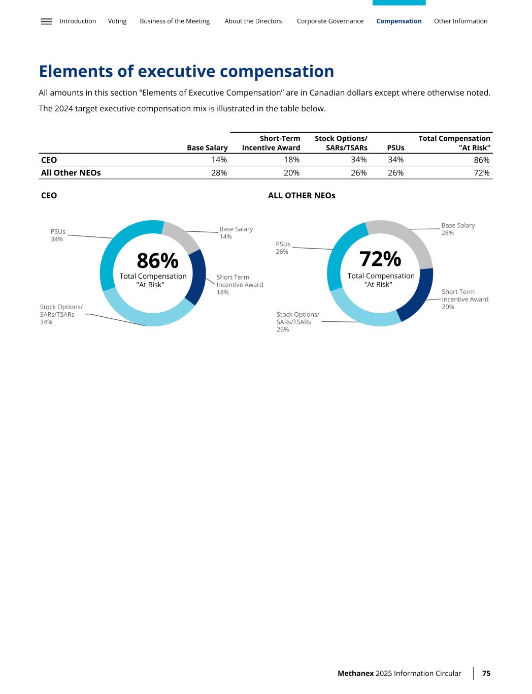 Elements of executive compensation All amounts in this section “Elements of Executive Compensation” are in Canadian dollars except where otherwise noted. The 2024 target executive compensation mix is illustrated in the table below. Base Salary Short-Term Incentive Award Stock Options/ SARs/TSARs PSUs Total Compensation "At Risk" CEO 14% 18% 34% 34% 86% All Other NEOs 28% 20% 26% 26% 72% CEO ALL OTHER NEOs PSUs 34% Base Salary 14% Short Term Incentive Award 18% Stock Options/ SARs/TSARs 34% 86% Total Compensation "At Risk" PSUs 26% Base Salary 28% Short Term Incentive Award 20% Stock Options/ SARs/TSARs 26% 72% Total Compensation "At Risk" Introduction Voting Business of the Meeting About the Directors Corporate Governance Compensation Other Information Methanex 2025 Information Circular 75