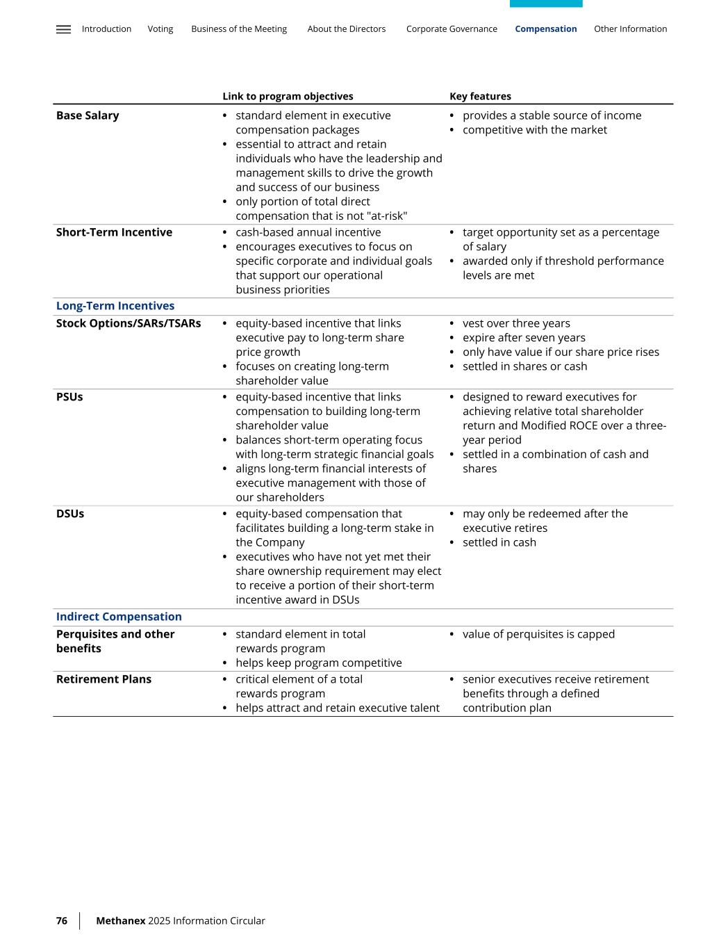 Link to program objectives Key features Base Salary • standard element in executive compensation packages • essential to attract and retain individuals who have the leadership and management skills to drive the growth and success of our business • only portion of total direct compensation that is not "at-risk" • provides a stable source of income • competitive with the market Short-Term Incentive • cash-based annual incentive • encourages executives to focus on specific corporate and individual goals that support our operational business priorities • target opportunity set as a percentage of salary • awarded only if threshold performance levels are met Long-Term Incentives Stock Options/SARs/TSARs • equity-based incentive that links executive pay to long-term share price growth • focuses on creating long-term shareholder value • vest over three years • expire after seven years • only have value if our share price rises • settled in shares or cash PSUs • equity-based incentive that links compensation to building long-term shareholder value • balances short-term operating focus with long-term strategic financial goals • aligns long-term financial interests of executive management with those of our shareholders • designed to reward executives for achieving relative total shareholder return and Modified ROCE over a three- year period • settled in a combination of cash and shares DSUs • equity-based compensation that facilitates building a long-term stake in the Company • executives who have not yet met their share ownership requirement may elect to receive a portion of their short-term incentive award in DSUs • may only be redeemed after the executive retires • settled in cash Indirect Compensation Perquisites and other benefits • standard element in total rewards program • helps keep program competitive • value of perquisites is capped Retirement Plans • critical element of a total rewards program • helps attract and retain executive talent • senior executives receive retirement benefits through a defined contribution plan Introduction Voting Business of the Meeting About the Directors Corporate Governance Compensation Other Information 76 Methanex 2025 Information Circular