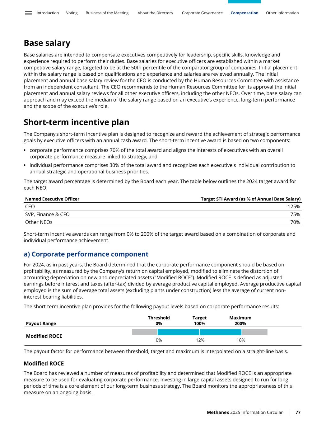 Base salary Base salaries are intended to compensate executives competitively for leadership, specific skills, knowledge and experience required to perform their duties. Base salaries for executive officers are established within a market competitive salary range, targeted to be at the 50th percentile of the comparator group of companies. Initial placement within the salary range is based on qualifications and experience and salaries are reviewed annually. The initial placement and annual base salary review for the CEO is conducted by the Human Resources Committee with assistance from an independent consultant. The CEO recommends to the Human Resources Committee for its approval the initial placement and annual salary reviews for all other executive officers, including the other NEOs. Over time, base salary can approach and may exceed the median of the salary range based on an executive’s experience, long-term performance and the scope of the executive’s role. Short-term incentive plan The Company’s short-term incentive plan is designed to recognize and reward the achievement of strategic performance goals by executive officers with an annual cash award. The short-term incentive award is based on two components: • corporate performance comprises 70% of the total award and aligns the interests of executives with an overall corporate performance measure linked to strategy, and • individual performance comprises 30% of the total award and recognizes each executive's individual contribution to annual strategic and operational business priorities. The target award percentage is determined by the Board each year. The table below outlines the 2024 target award for each NEO: Named Executive Officer Target STI Award (as % of Annual Base Salary) CEO 125% SVP, Finance & CFO 75% Other NEOs 70% Short-term incentive awards can range from 0% to 200% of the target award based on a combination of corporate and individual performance achievement. a) Corporate performance component For 2024, as in past years, the Board determined that the corporate performance component should be based on profitability, as measured by the Company’s return on capital employed, modified to eliminate the distortion of accounting depreciation on new and depreciated assets (“Modified ROCE”). Modified ROCE is defined as adjusted earnings before interest and taxes (after-tax) divided by average productive capital employed. Average productive capital employed is the sum of average total assets (excluding plants under construction) less the average of current non- interest bearing liabilities. The short-term incentive plan provides for the following payout levels based on corporate performance results: Payout Range Threshold 0% Target 100% Maximum 200% Modified ROCE 0% 12% 18% The payout factor for performance between threshold, target and maximum is interpolated on a straight-line basis. Modified ROCE The Board has reviewed a number of measures of profitability and determined that Modified ROCE is an appropriate measure to be used for evaluating corporate performance. Investing in large capital assets designed to run for long periods of time is a core element of our long-term business strategy. The Board monitors the appropriateness of this measure on an ongoing basis. Introduction Voting Business of the Meeting About the Directors Corporate Governance Compensation Other Information Methanex 2025 Information Circular 77
