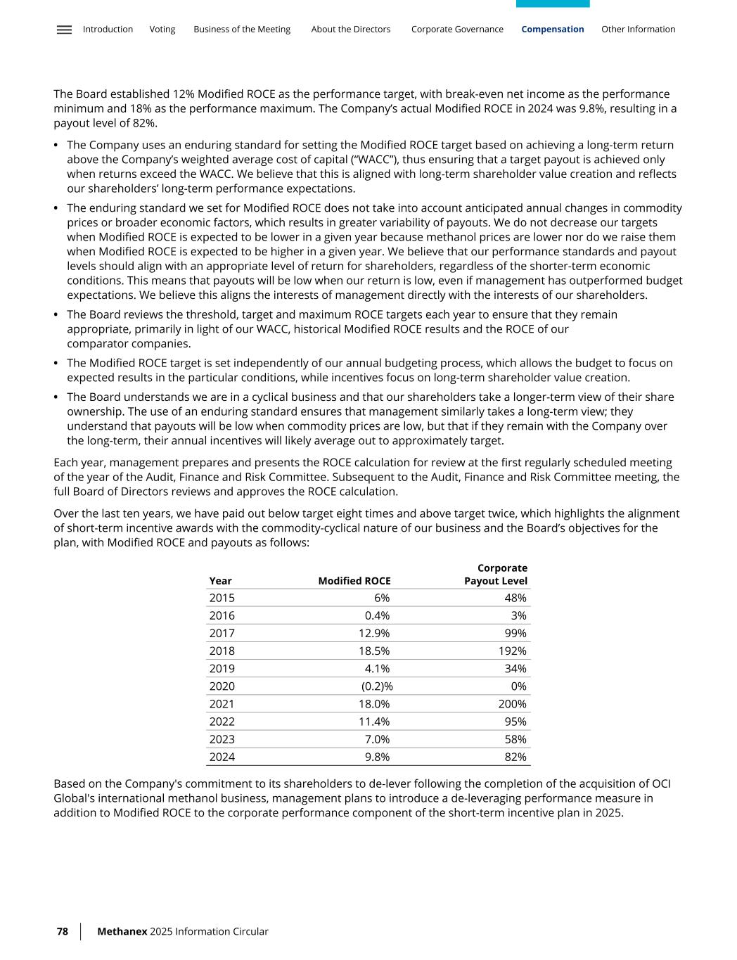 The Board established 12% Modified ROCE as the performance target, with break-even net income as the performance minimum and 18% as the performance maximum. The Company’s actual Modified ROCE in 2024 was 9.8%, resulting in a payout level of 82%. • The Company uses an enduring standard for setting the Modified ROCE target based on achieving a long-term return above the Company’s weighted average cost of capital (“WACC”), thus ensuring that a target payout is achieved only when returns exceed the WACC. We believe that this is aligned with long-term shareholder value creation and reflects our shareholders’ long-term performance expectations. • The enduring standard we set for Modified ROCE does not take into account anticipated annual changes in commodity prices or broader economic factors, which results in greater variability of payouts. We do not decrease our targets when Modified ROCE is expected to be lower in a given year because methanol prices are lower nor do we raise them when Modified ROCE is expected to be higher in a given year. We believe that our performance standards and payout levels should align with an appropriate level of return for shareholders, regardless of the shorter-term economic conditions. This means that payouts will be low when our return is low, even if management has outperformed budget expectations. We believe this aligns the interests of management directly with the interests of our shareholders. • The Board reviews the threshold, target and maximum ROCE targets each year to ensure that they remain appropriate, primarily in light of our WACC, historical Modified ROCE results and the ROCE of our comparator companies. • The Modified ROCE target is set independently of our annual budgeting process, which allows the budget to focus on expected results in the particular conditions, while incentives focus on long-term shareholder value creation. • The Board understands we are in a cyclical business and that our shareholders take a longer-term view of their share ownership. The use of an enduring standard ensures that management similarly takes a long-term view; they understand that payouts will be low when commodity prices are low, but that if they remain with the Company over the long-term, their annual incentives will likely average out to approximately target. Each year, management prepares and presents the ROCE calculation for review at the first regularly scheduled meeting of the year of the Audit, Finance and Risk Committee. Subsequent to the Audit, Finance and Risk Committee meeting, the full Board of Directors reviews and approves the ROCE calculation. Over the last ten years, we have paid out below target eight times and above target twice, which highlights the alignment of short-term incentive awards with the commodity-cyclical nature of our business and the Board’s objectives for the plan, with Modified ROCE and payouts as follows: Year Modified ROCE Corporate Payout Level 2015 6% 48% 2016 0.4% 3% 2017 12.9% 99% 2018 18.5% 192% 2019 4.1% 34% 2020 (0.2) % 0% 2021 18.0% 200% 2022 11.4% 95% 2023 7.0% 58% 2024 9.8% 82% Based on the Company's commitment to its shareholders to de-lever following the completion of the acquisition of OCI Global's international methanol business, management plans to introduce a de-leveraging performance measure in addition to Modified ROCE to the corporate performance component of the short-term incentive plan in 2025. Introduction Voting Business of the Meeting About the Directors Corporate Governance Compensation Other Information 78 Methanex 2025 Information Circular