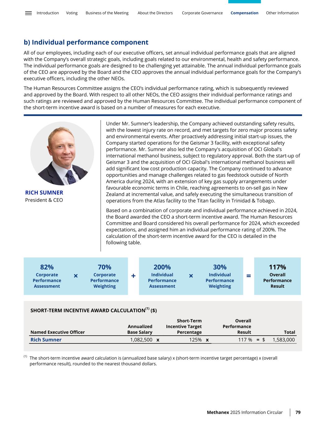 b) Individual performance component All of our employees, including each of our executive officers, set annual individual performance goals that are aligned with the Company’s overall strategic goals, including goals related to our environmental, health and safety performance. The individual performance goals are designed to be challenging yet attainable. The annual individual performance goals of the CEO are approved by the Board and the CEO approves the annual individual performance goals for the Company’s executive officers, including the other NEOs. The Human Resources Committee assigns the CEO’s individual performance rating, which is subsequently reviewed and approved by the Board. With respect to all other NEOs, the CEO assigns their individual performance ratings and such ratings are reviewed and approved by the Human Resources Committee. The individual performance component of the short-term incentive award is based on a number of measures for each executive. RICH SUMNER President & CEO Under Mr. Sumner’s leadership, the Company achieved outstanding safety results, with the lowest injury rate on record, and met targets for zero major process safety and environmental events. After proactively addressing initial start-up issues, the Company started operations for the Geismar 3 facility, with exceptional safety performance. Mr. Sumner also led the Company's acquisition of OCI Global's international methanol business, subject to regulatory approval. Both the start-up of Geismar 3 and the acquisition of OCI Global's international methanol business will add significant low cost production capacity. The Company continued to advance opportunities and manage challenges related to gas feedstock outside of North America during 2024, with an extension of key gas supply arrangements under favourable economic terms in Chile, reaching agreements to on-sell gas in New Zealand at incremental value, and safely executing the simultaneous transition of operations from the Atlas facility to the Titan facility in Trinidad & Tobago. Based on a combination of corporate and individual performance achieved in 2024, the Board awarded the CEO a short-term incentive award. The Human Resources Committee and Board considered his overall performance for 2024, which exceeded expectations, and assigned him an individual performance rating of 200%. The calculation of the short-term incentive award for the CEO is detailed in the following table. 82% Corporate Performance Assessment × 70% Corporate Performance Weighting + 200% Individual Performance Assessment × 30% Individual Performance Weighting = 117% Overall Performance Result SHORT-TERM INCENTIVE AWARD CALCULATION(1) ($) Named Executive Officer Annualized Base Salary Short-Term Incentive Target Percentage Overall Performance Result Total Rich Sumner 1,082,500 x 125% x 117 % = $ 1,583,000 (1) The short-term incentive award calculation is (annualized base salary) x (short-term incentive target percentage) x (overall performance result), rounded to the nearest thousand dollars. Introduction Voting Business of the Meeting About the Directors Corporate Governance Compensation Other Information Methanex 2025 Information Circular 79