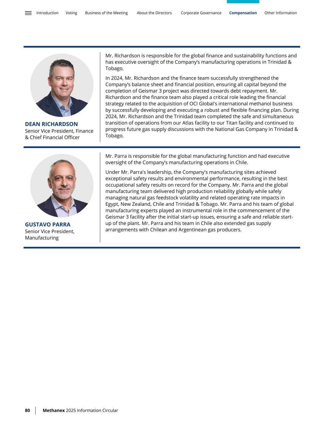 DEAN RICHARDSON Senior Vice President, Finance & Chief Financial Officer Mr. Richardson is responsible for the global finance and sustainability functions and has executive oversight of the Company’s manufacturing operations in Trinidad & Tobago. In 2024, Mr. Richardson and the finance team successfully strengthened the Company’s balance sheet and financial position, ensuring all capital beyond the completion of Geismar 3 project was directed towards debt repayment. Mr. Richardson and the finance team also played a critical role leading the financial strategy related to the acquisition of OCI Global's international methanol business by successfully developing and executing a robust and flexible financing plan. During 2024, Mr. Richardson and the Trinidad team completed the safe and simultaneous transition of operations from our Atlas facility to our Titan facility and continued to progress future gas supply discussions with the National Gas Company in Trinidad & Tobago. GUSTAVO PARRA Senior Vice President, Manufacturing Mr. Parra is responsible for the global manufacturing function and had executive oversight of the Company’s manufacturing operations in Chile. Under Mr. Parra's leadership, the Company's manufacturing sites achieved exceptional safety results and environmental performance, resulting in the best occupational safety results on record for the Company. Mr. Parra and the global manufacturing team delivered high production reliability globally while safely managing natural gas feedstock volatility and related operating rate impacts in Egypt, New Zealand, Chile and Trinidad & Tobago. Mr. Parra and his team of global manufacturing experts played an instrumental role in the commencement of the Geismar 3 facility after the initial start-up issues, ensuring a safe and reliable start- up of the plant. Mr. Parra and his team in Chile also extended gas supply arrangements with Chilean and Argentinean gas producers. Introduction Voting Business of the Meeting About the Directors Corporate Governance Compensation Other Information 80 Methanex 2025 Information Circular