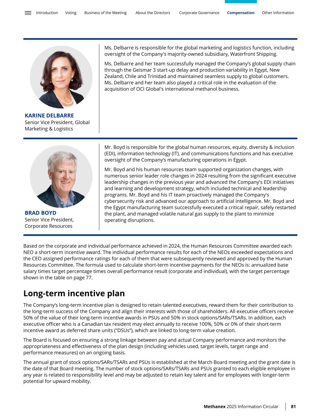 KARINE DELBARRE Senior Vice President, Global Marketing & Logistics Ms. Delbarre is responsible for the global marketing and logistics function, including oversight of the Company's majority-owned subsidiary, Waterfront Shipping. Ms. Delbarre and her team successfully managed the Company’s global supply chain through the Geismar 3 start-up delay and production variability in Egypt, New Zealand, Chile and Trinidad and maintained seamless supply to global customers. Ms. Delbarre and her team also played a critical role in the evaluation of the acquisition of OCI Global's international methanol business. BRAD BOYD Senior Vice President, Corporate Resources Mr. Boyd is responsible for the global human resources, equity, diversity & inclusion (EDI), information technology (IT), and communications functions and has executive oversight of the Company’s manufacturing operations in Egypt. Mr. Boyd and his human resources team supported organization changes, with numerous senior leader role changes in 2024 resulting from the significant executive leadership changes in the previous year and advanced the Company's EDI initiatives and learning and development strategy, which included technical and leadership programs. Mr. Boyd and his IT team proactively managed the Company's cybersecurity risk and advanced our approach to artificial intelligence. Mr. Boyd and the Egypt manufacturing team successfully executed a critical repair, safely restarted the plant, and managed volatile natural gas supply to the plant to minimize operating disruptions. Based on the corporate and individual performance achieved in 2024, the Human Resources Committee awarded each NEO a short-term incentive award. The individual performance results for each of the NEOs exceeded expectations and the CEO assigned performance ratings for each of them that were subsequently reviewed and approved by the Human Resources Committee. The formula used to calculate short-term incentive payments for the NEOs is: annualized base salary times target percentage times overall performance result (corporate and individual), with the target percentage shown in the table on page 77. Long-term incentive plan The Company’s long-term incentive plan is designed to retain talented executives, reward them for their contribution to the long-term success of the Company and align their interests with those of shareholders. All executive officers receive 50% of the value of their long-term incentive awards in PSUs and 50% in stock options/SARs/TSARs. In addition, each executive officer who is a Canadian tax resident may elect annually to receive 100%, 50% or 0% of their short-term incentive award as deferred share units (“DSUs”), which are linked to long-term value creation. The Board is focused on ensuring a strong linkage between pay and actual Company performance and monitors the appropriateness and effectiveness of the plan design (including vehicles used, target levels, target range and performance measures) on an ongoing basis. The annual grant of stock options/SARs/TSARs and PSUs is established at the March Board meeting and the grant date is the date of that Board meeting. The number of stock options/SARs/TSARs and PSUs granted to each eligible employee in any year is related to responsibility level and may be adjusted to retain key talent and for employees with longer-term potential for upward mobility. Introduction Voting Business of the Meeting About the Directors Corporate Governance Compensation Other Information Methanex 2025 Information Circular 81