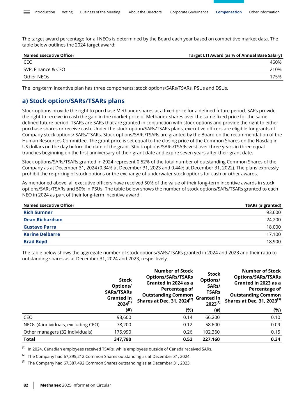 The target award percentage for all NEOs is determined by the Board each year based on competitive market data. The table below outlines the 2024 target award: Named Executive Officer Target LTI Award (as % of Annual Base Salary) CEO 460% SVP, Finance & CFO 210% Other NEOs 175% The long-term incentive plan has three components: stock options/SARs/TSARs, PSUs and DSUs. a) Stock option/SARs/TSARs plans Stock options provide the right to purchase Methanex shares at a fixed price for a defined future period. SARs provide the right to receive in cash the gain in the market price of Methanex shares over the same fixed price for the same defined future period. TSARs are SARs that are granted in conjunction with stock options and provide the right to either purchase shares or receive cash. Under the stock option/SARs/TSARs plans, executive officers are eligible for grants of Company stock options/ SARs/TSARs. Stock options/SARs/TSARs are granted by the Board on the recommendation of the Human Resources Committee. The grant price is set equal to the closing price of the Common Shares on the Nasdaq in US dollars on the day before the date of the grant. Stock options/SARs/TSARs vest over three years in three equal tranches beginning on the first anniversary of their grant date and expire seven years after their grant date. Stock options/SARs/TSARs granted in 2024 represent 0.52% of the total number of outstanding Common Shares of the Company as at December 31, 2024 (0.34% at December 31, 2023 and 0.44% at December 31, 2022). The plans expressly prohibit the re-pricing of stock options or the exchange of underwater stock options for cash or other awards. As mentioned above, all executive officers have received 50% of the value of their long-term incentive awards in stock options/SARs/TSARs and 50% in PSUs. The table below shows the number of stock options/SARs/TSARs granted to each NEO in 2024 as part of their long-term incentive award: Named Executive Officer TSARs (# granted) Rich Sumner 93,600 Dean Richardson 24,200 Gustavo Parra 18,000 Karine Delbarre 17,100 Brad Boyd 18,900 The table below shows the aggregate number of stock options/SARs/TSARs granted in 2024 and 2023 and their ratio to outstanding shares as at December 31, 2024 and 2023, respectively. Stock Options/ SARs/TSARs Granted in 2024(1) (#) Number of Stock Options/SARs/TSARs Granted in 2024 as a Percentage of Outstanding Common Shares at Dec. 31, 2024(2) (%) Stock Options/ SARs/ TSARs Granted in 2023(1) (#) Number of Stock Options/SARs/TSARs Granted in 2023 as a Percentage of Outstanding Common Shares at Dec. 31, 2023(3) (%) CEO 93,600 0.14 66,200 0.10 NEOs (4 individuals, excluding CEO) 78,200 0.12 58,600 0.09 Other managers (32 individuals) 175,990 0.26 102,360 0.15 Total 347,790 0.52 227,160 0.34 (1) In 2024, Canadian employees received TSARs, while employees outside of Canada received SARs. (2) The Company had 67,395,212 Common Shares outstanding as at December 31, 2024. (3) The Company had 67,387,492 Common Shares outstanding as at December 31, 2023. Introduction Voting Business of the Meeting About the Directors Corporate Governance Compensation Other Information 82 Methanex 2025 Information Circular