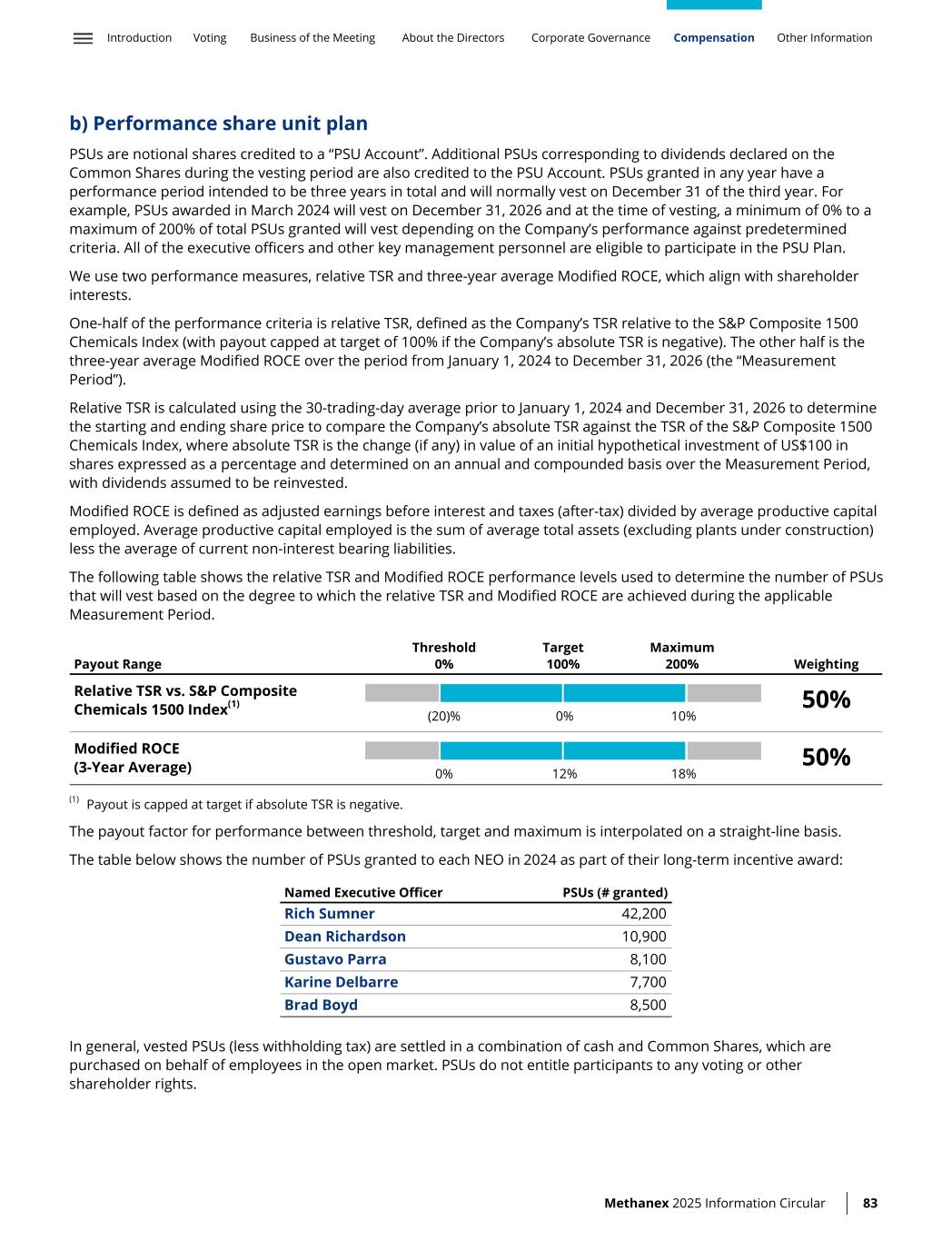 b) Performance share unit plan PSUs are notional shares credited to a “PSU Account”. Additional PSUs corresponding to dividends declared on the Common Shares during the vesting period are also credited to the PSU Account. PSUs granted in any year have a performance period intended to be three years in total and will normally vest on December 31 of the third year. For example, PSUs awarded in March 2024 will vest on December 31, 2026 and at the time of vesting, a minimum of 0% to a maximum of 200% of total PSUs granted will vest depending on the Company’s performance against predetermined criteria. All of the executive officers and other key management personnel are eligible to participate in the PSU Plan. We use two performance measures, relative TSR and three-year average Modified ROCE, which align with shareholder interests. One-half of the performance criteria is relative TSR, defined as the Company’s TSR relative to the S&P Composite 1500 Chemicals Index (with payout capped at target of 100% if the Company’s absolute TSR is negative). The other half is the three-year average Modified ROCE over the period from January 1, 2024 to December 31, 2026 (the “Measurement Period”). Relative TSR is calculated using the 30-trading-day average prior to January 1, 2024 and December 31, 2026 to determine the starting and ending share price to compare the Company’s absolute TSR against the TSR of the S&P Composite 1500 Chemicals Index, where absolute TSR is the change (if any) in value of an initial hypothetical investment of US$100 in shares expressed as a percentage and determined on an annual and compounded basis over the Measurement Period, with dividends assumed to be reinvested. Modified ROCE is defined as adjusted earnings before interest and taxes (after-tax) divided by average productive capital employed. Average productive capital employed is the sum of average total assets (excluding plants under construction) less the average of current non-interest bearing liabilities. The following table shows the relative TSR and Modified ROCE performance levels used to determine the number of PSUs that will vest based on the degree to which the relative TSR and Modified ROCE are achieved during the applicable Measurement Period. Payout Range Threshold 0% Target 100% Maximum 200% Weighting Relative TSR vs. S&P Composite Chemicals 1500 Index(1) 50% (20)% 0% 10% Modified ROCE (3-Year Average) 50% 0% 12% 18% (1) Payout is capped at target if absolute TSR is negative. The payout factor for performance between threshold, target and maximum is interpolated on a straight-line basis. The table below shows the number of PSUs granted to each NEO in 2024 as part of their long-term incentive award: Named Executive Officer PSUs (# granted) Rich Sumner 42,200 Dean Richardson 10,900 Gustavo Parra 8,100 Karine Delbarre 7,700 Brad Boyd 8,500 In general, vested PSUs (less withholding tax) are settled in a combination of cash and Common Shares, which are purchased on behalf of employees in the open market. PSUs do not entitle participants to any voting or other shareholder rights. Introduction Voting Business of the Meeting About the Directors Corporate Governance Compensation Other Information Methanex 2025 Information Circular 83
