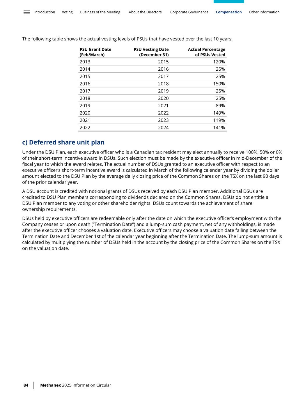 The following table shows the actual vesting levels of PSUs that have vested over the last 10 years. PSU Grant Date (Feb/March) PSU Vesting Date (December 31) Actual Percentage of PSUs Vested 2013 2015 120% 2014 2016 25% 2015 2017 25% 2016 2018 150% 2017 2019 25% 2018 2020 25% 2019 2021 89% 2020 2022 149% 2021 2023 119% 2022 2024 141% c) Deferred share unit plan Under the DSU Plan, each executive officer who is a Canadian tax resident may elect annually to receive 100%, 50% or 0% of their short-term incentive award in DSUs. Such election must be made by the executive officer in mid-December of the fiscal year to which the award relates. The actual number of DSUs granted to an executive officer with respect to an executive officer’s short-term incentive award is calculated in March of the following calendar year by dividing the dollar amount elected to the DSU Plan by the average daily closing price of the Common Shares on the TSX on the last 90 days of the prior calendar year. A DSU account is credited with notional grants of DSUs received by each DSU Plan member. Additional DSUs are credited to DSU Plan members corresponding to dividends declared on the Common Shares. DSUs do not entitle a DSU Plan member to any voting or other shareholder rights. DSUs count towards the achievement of share ownership requirements. DSUs held by executive officers are redeemable only after the date on which the executive officer’s employment with the Company ceases or upon death (“Termination Date”) and a lump-sum cash payment, net of any withholdings, is made after the executive officer chooses a valuation date. Executive officers may choose a valuation date falling between the Termination Date and December 1st of the calendar year beginning after the Termination Date. The lump-sum amount is calculated by multiplying the number of DSUs held in the account by the closing price of the Common Shares on the TSX on the valuation date. Introduction Voting Business of the Meeting About the Directors Corporate Governance Compensation Other Information 84 Methanex 2025 Information Circular