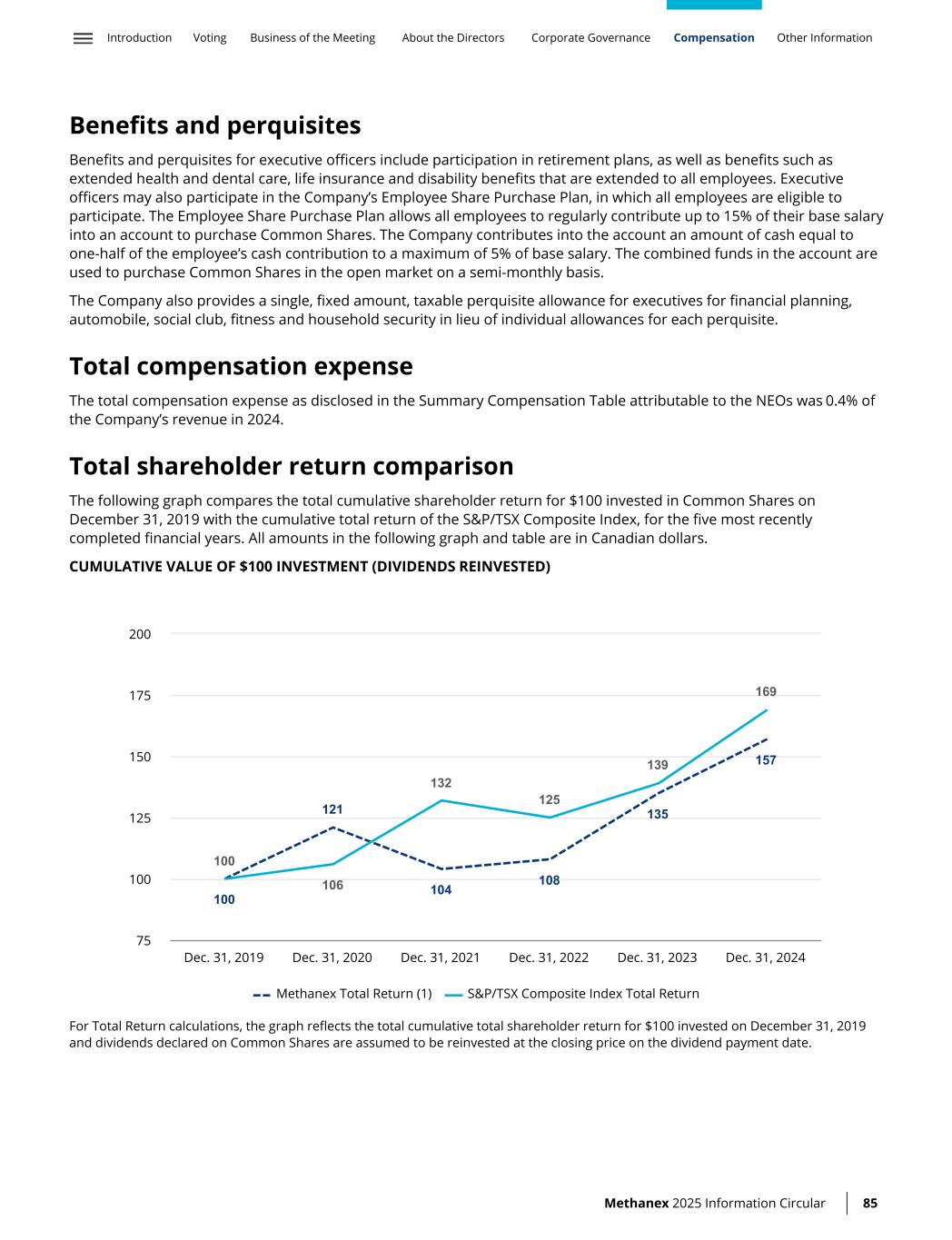 Benefits and perquisites Benefits and perquisites for executive officers include participation in retirement plans, as well as benefits such as extended health and dental care, life insurance and disability benefits that are extended to all employees. Executive officers may also participate in the Company’s Employee Share Purchase Plan, in which all employees are eligible to participate. The Employee Share Purchase Plan allows all employees to regularly contribute up to 15% of their base salary into an account to purchase Common Shares. The Company contributes into the account an amount of cash equal to one-half of the employee’s cash contribution to a maximum of 5% of base salary. The combined funds in the account are used to purchase Common Shares in the open market on a semi-monthly basis. The Company also provides a single, fixed amount, taxable perquisite allowance for executives for financial planning, automobile, social club, fitness and household security in lieu of individual allowances for each perquisite. Total compensation expense The total compensation expense as disclosed in the Summary Compensation Table attributable to the NEOs was 0.4% of the Company’s revenue in 2024. Total shareholder return comparison The following graph compares the total cumulative shareholder return for $100 invested in Common Shares on December 31, 2019 with the cumulative total return of the S&P/TSX Composite Index, for the five most recently completed financial years. All amounts in the following graph and table are in Canadian dollars. CUMULATIVE VALUE OF $100 INVESTMENT (DIVIDENDS REINVESTED) 100 121 104 108 135 157 100 106 132 125 139 169 Methanex Total Return (1) S&P/TSX Composite Index Total Return Dec. 31, 2019 Dec. 31, 2020 Dec. 31, 2021 Dec. 31, 2022 Dec. 31, 2023 Dec. 31, 2024 75 100 125 150 175 200 For Total Return calculations, the graph reflects the total cumulative total shareholder return for $100 invested on December 31, 2019 and dividends declared on Common Shares are assumed to be reinvested at the closing price on the dividend payment date. Introduction Voting Business of the Meeting About the Directors Corporate Governance Compensation Other Information Methanex 2025 Information Circular 85