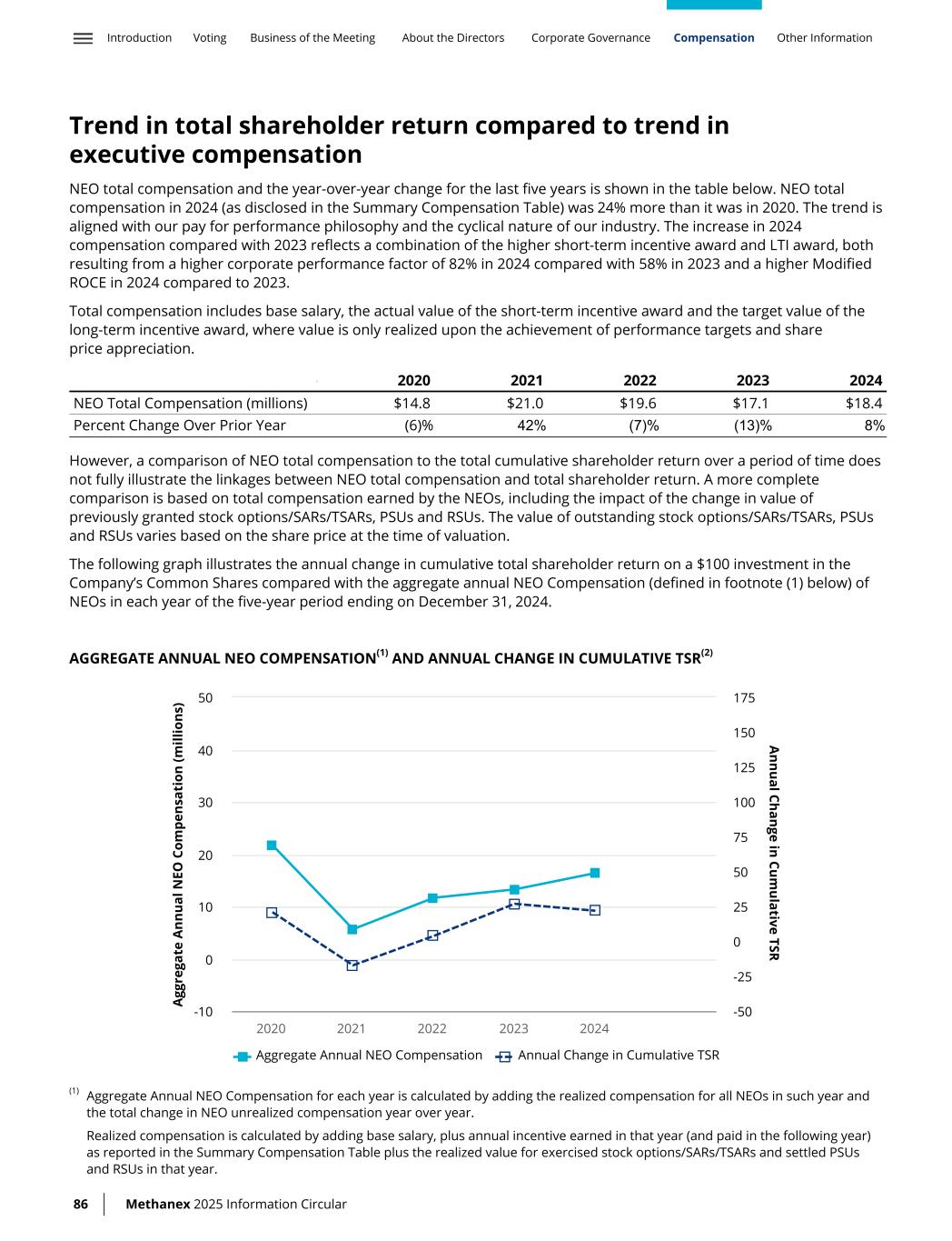 Trend in total shareholder return compared to trend in executive compensation NEO total compensation and the year-over-year change for the last five years is shown in the table below. NEO total compensation in 2024 (as disclosed in the Summary Compensation Table) was 24% more than it was in 2020. The trend is aligned with our pay for performance philosophy and the cyclical nature of our industry. The increase in 2024 compensation compared with 2023 reflects a combination of the higher short-term incentive award and LTI award, both resulting from a higher corporate performance factor of 82% in 2024 compared with 58% in 2023 and a higher Modified ROCE in 2024 compared to 2023. Total compensation includes base salary, the actual value of the short-term incentive award and the target value of the long-term incentive award, where value is only realized upon the achievement of performance targets and share price appreciation. 1 9 2020 2021 2022 2023 2024 NEO Total Compensation (millions) $14.8 $21.0 $19.6 $17.1 $18.4 Percent Change Over Prior Year (6) % 42 % (7) % (13) % 8 % However, a comparison of NEO total compensation to the total cumulative shareholder return over a period of time does not fully illustrate the linkages between NEO total compensation and total shareholder return. A more complete comparison is based on total compensation earned by the NEOs, including the impact of the change in value of previously granted stock options/SARs/TSARs, PSUs and RSUs. The value of outstanding stock options/SARs/TSARs, PSUs and RSUs varies based on the share price at the time of valuation. The following graph illustrates the annual change in cumulative total shareholder return on a $100 investment in the Company’s Common Shares compared with the aggregate annual NEO Compensation (defined in footnote (1) below) of NEOs in each year of the five-year period ending on December 31, 2024. AGGREGATE ANNUAL NEO COMPENSATION(1) AND ANNUAL CHANGE IN CUMULATIVE TSR(2) A gg re ga te A nn ua l N EO C om pe ns at io n (m ill io ns ) A nnual Change in Cum ulative TSR Aggregate Annual NEO Compensation Annual Change in Cumulative TSR 2020 2021 2022 2023 2024 -10 0 10 20 30 40 50 -50 -25 0 25 50 75 100 125 150 175 (1) Aggregate Annual NEO Compensation for each year is calculated by adding the realized compensation for all NEOs in such year and the total change in NEO unrealized compensation year over year. Realized compensation is calculated by adding base salary, plus annual incentive earned in that year (and paid in the following year) as reported in the Summary Compensation Table plus the realized value for exercised stock options/SARs/TSARs and settled PSUs and RSUs in that year. Introduction Voting Business of the Meeting About the Directors Corporate Governance Compensation Other Information 86 Methanex 2025 Information Circular