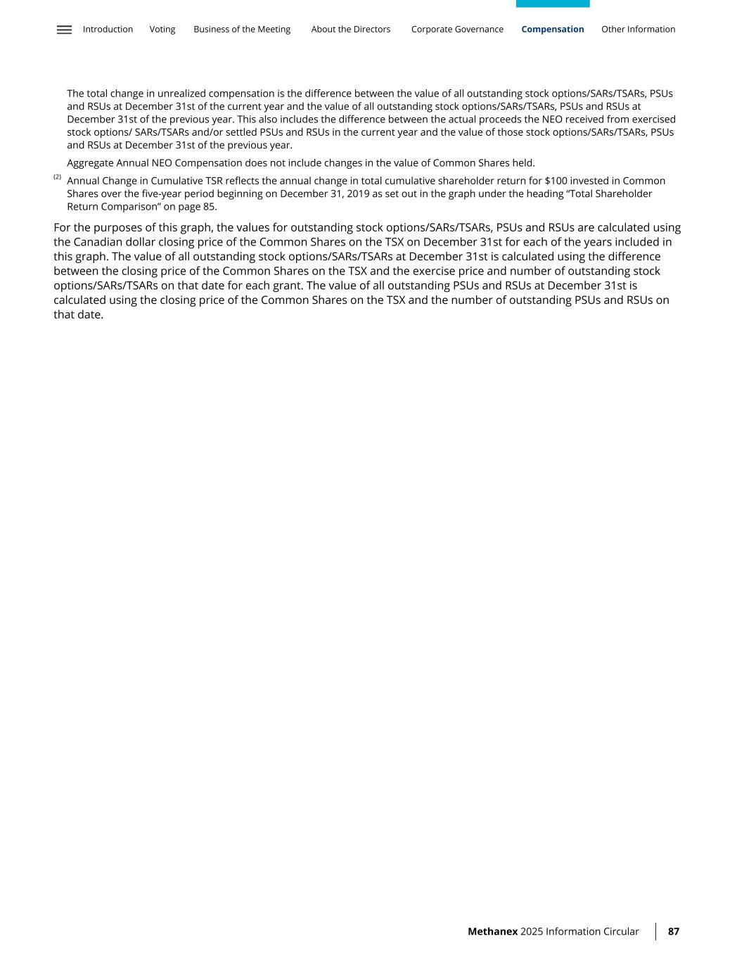 The total change in unrealized compensation is the difference between the value of all outstanding stock options/SARs/TSARs, PSUs and RSUs at December 31st of the current year and the value of all outstanding stock options/SARs/TSARs, PSUs and RSUs at December 31st of the previous year. This also includes the difference between the actual proceeds the NEO received from exercised stock options/ SARs/TSARs and/or settled PSUs and RSUs in the current year and the value of those stock options/SARs/TSARs, PSUs and RSUs at December 31st of the previous year. Aggregate Annual NEO Compensation does not include changes in the value of Common Shares held. (2) Annual Change in Cumulative TSR reflects the annual change in total cumulative shareholder return for $100 invested in Common Shares over the five-year period beginning on December 31, 2019 as set out in the graph under the heading “Total Shareholder Return Comparison” on page 85. For the purposes of this graph, the values for outstanding stock options/SARs/TSARs, PSUs and RSUs are calculated using the Canadian dollar closing price of the Common Shares on the TSX on December 31st for each of the years included in this graph. The value of all outstanding stock options/SARs/TSARs at December 31st is calculated using the difference between the closing price of the Common Shares on the TSX and the exercise price and number of outstanding stock options/SARs/TSARs on that date for each grant. The value of all outstanding PSUs and RSUs at December 31st is calculated using the closing price of the Common Shares on the TSX and the number of outstanding PSUs and RSUs on that date. Introduction Voting Business of the Meeting About the Directors Corporate Governance Compensation Other Information Methanex 2025 Information Circular 87